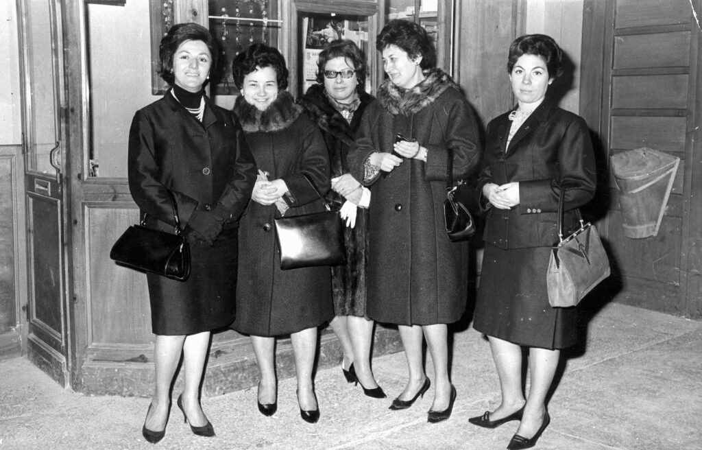 Les professores Ana M. Sáenz (francès), Felisa López (matemàtiques), Amelia de Castro (ciències), Josepa Cardó (història) i Marisa Gómez (llengua espanyola) al vestíbul de l’Institut, davant la cabina de consergeria, als anys 60. Les cinc van passar tota o gairebé tota la seva vida laboral a l’Institut.
