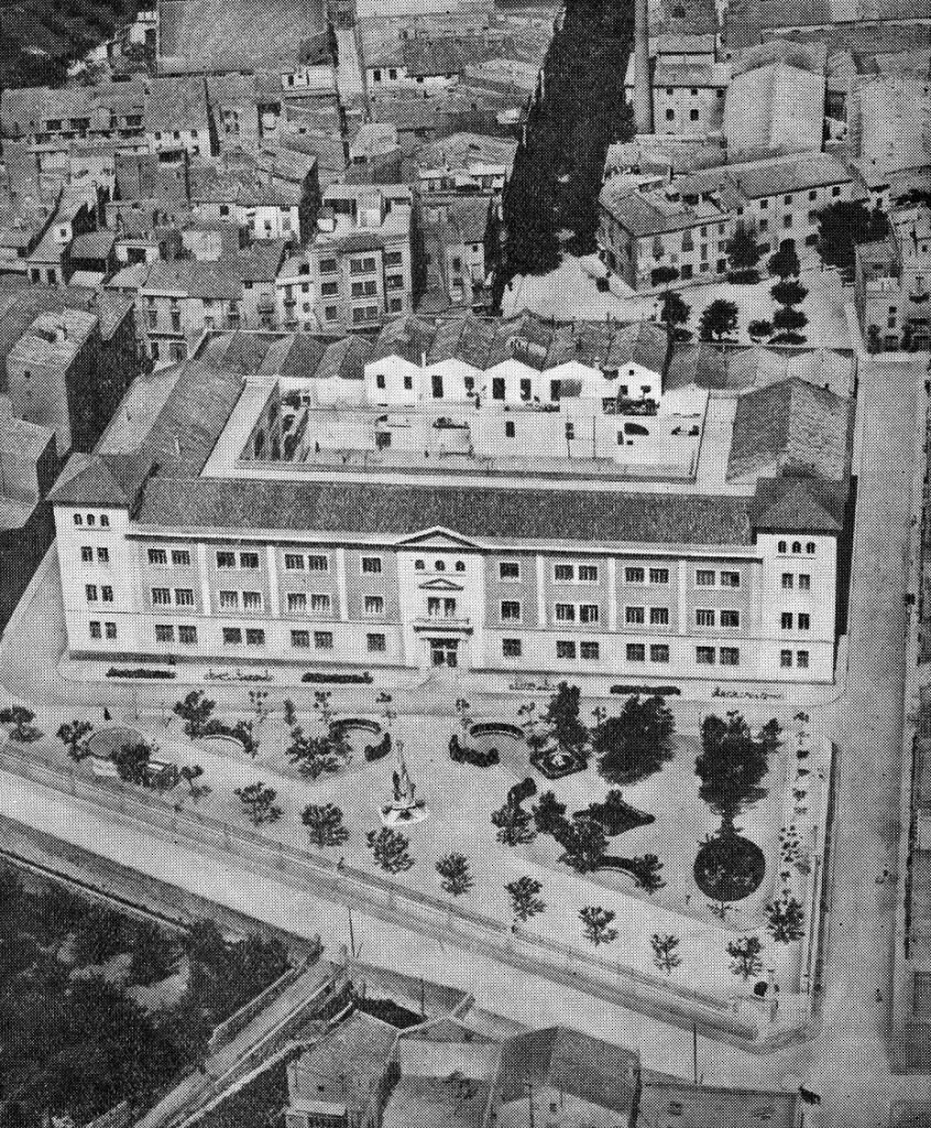 En aquesta fotografia aèria de l’any 1960 podem veure l’aspecte de l’edifici històric un cop acabades les obres d’adequació de l’antic quarter.