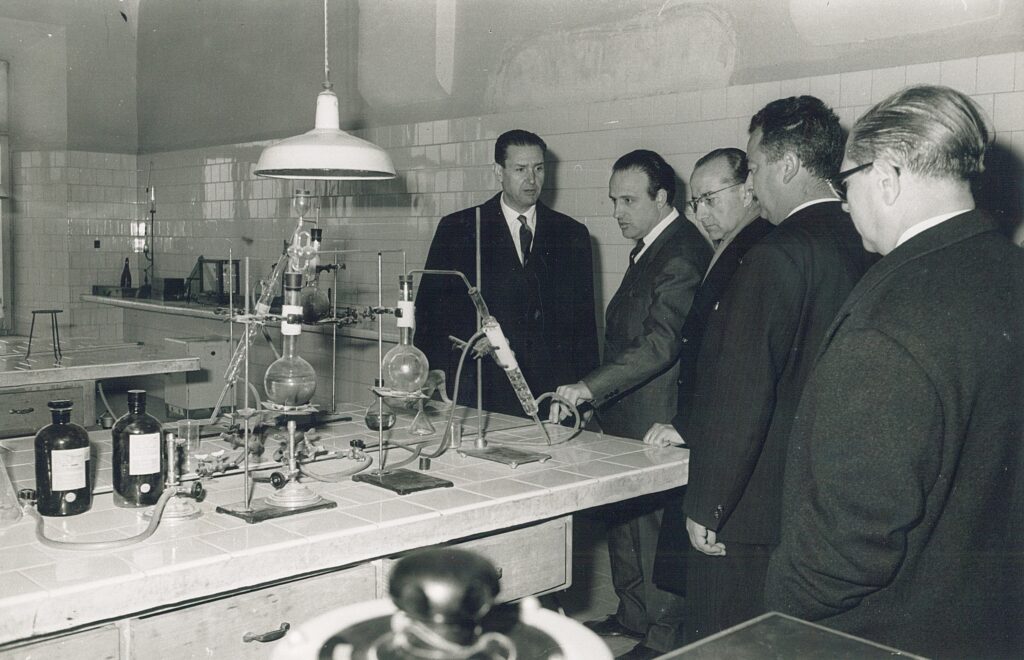 La imatge il·lustra una visita a l’institut de l’inspector general d’educació el 1962-63. Hi veiem un dels apreciats laboratoris i el professor Octavi Roca (segon per l’esquerra) que en fa les oportunes explicacions. També s’hi pot veure l’aleshores director del centre, Jesús Guiral (quart per l’esquerra).