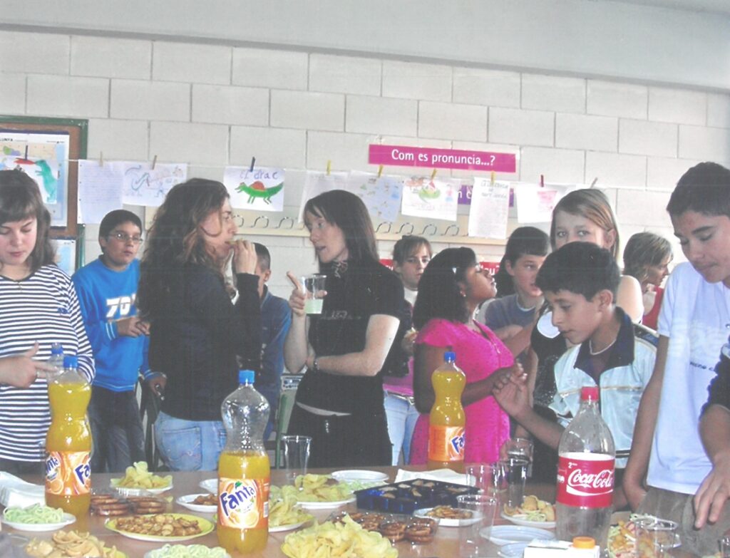 Curs 2007-08. Festa a l’Aula d’Acollida -recurs per a la integració de l’alumnat nouvingut que s’implantà en aquests anys- amb els alumnes i els seus padrins lingüístics. Al centre de la imatge, Cori Hernández, tutora de l’Aula, i Cristina Castellnou, professora de català.