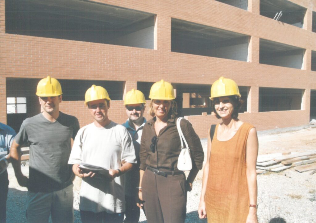 Estiu del 2001: visita a les obres del nou edifici. A la imatge veiem la directora de l’Institut, Carme Mansilla, acompanyada a la seva esquerra per la cap de departament de visual i plàstica, LLuïsa Clols, i, a la seva dreta, pel cap de departament de ciències, Jordi Plana, i el cap del departament d’educació física, Jordi Mateus; darrere, el secretari, Armand Carreras.
