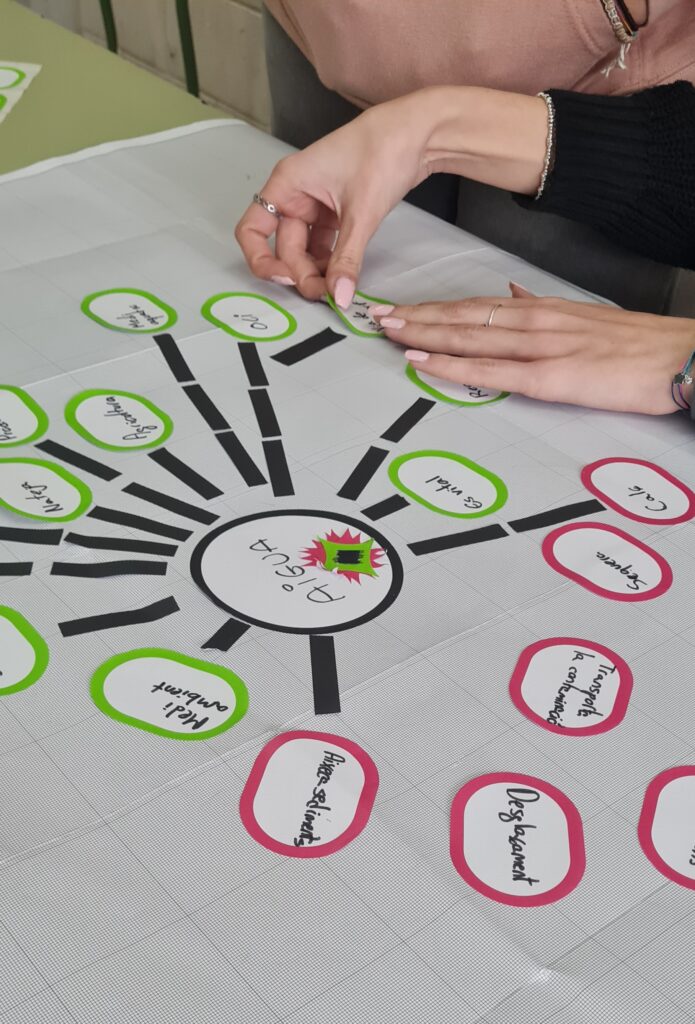 En aquest primer taller s’elaboren mapes conceptuals per grups/à mbits com energia, aigua, aire i una segona fase deliberació i activitats per a la proposta d’accions. Aquestes assemblees tindran una segona fase de consens i presa de decisions.