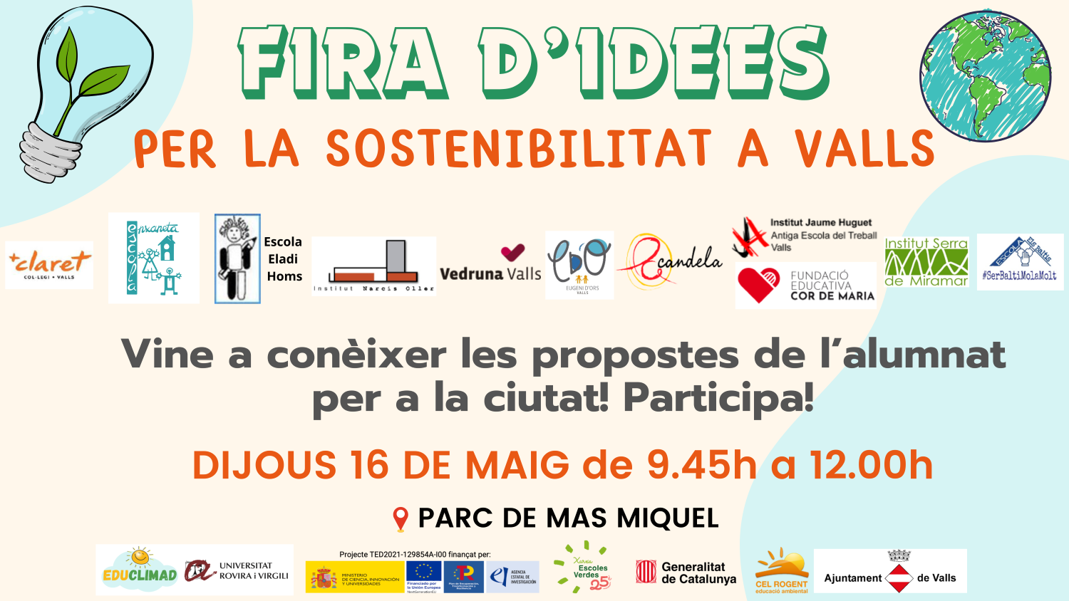 Els alumnes de 4t d’ESO conjuntament amb altres escoles i Instituts hem organitzat una Fira d’Idees per la Sostenibilitat @educlimad coordinat per la URV, que tindrà lloc el pròxim dijous 16 de maig de 9.45h a 12.00h al PARC DE MAS MIQUEL.