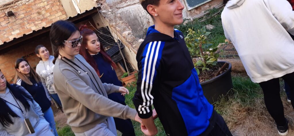 Tot seguit es va anar a l’Hort dels 4 Cantons, on, gràcies a Pere Vidal i la resta de persones que gestionen aquest espai, es va implementar la part pràctica de la formació. Es van realitzar diverses dinàmiques en petits grups d’equips interdisciplinars (TAPSD i TIS), on part de l’alumnat feia de persones amb diversitats funcionals (problemes de vista, fent servir diferents ulleres per les diferents afeccions, problemes de mobilitat, etc. ) i altres feien de Terapeutes hortícoles dirigint i acompanyant les persones usuàries, i es van plantar diferents llavors que amb l’arribada de la primavera creixeran i donaran fruit.