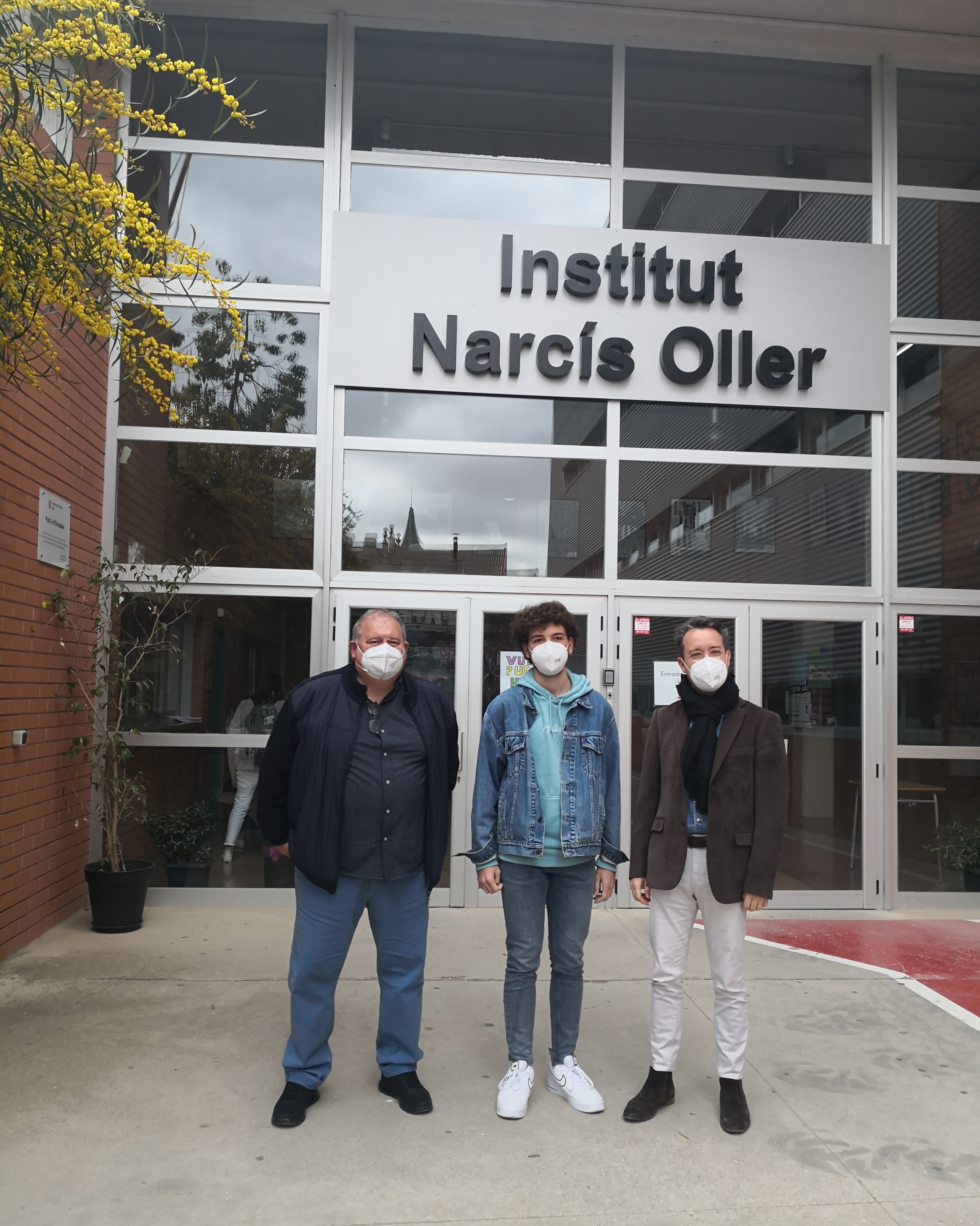 L’alumne Arnau Roig juntament amb l’Andreu Dexeus, director de l’Institut Narcís Oller i el professor d’Economia d’Empresa Carles Gallart.