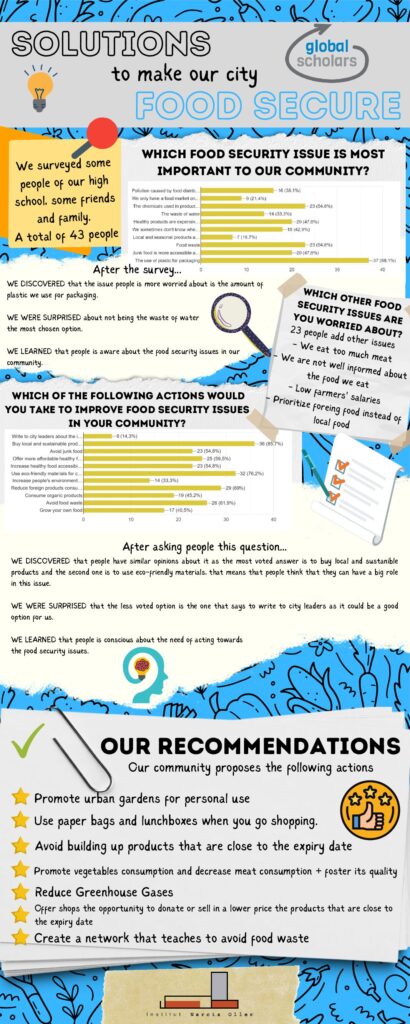 Quines solucions innovadores trobem a la nostra localitat en relació amb la seguretat alimentària? L’alumnat de Global Scholars van descobrir, de la mà d’experts, l’accés que tenim a una alimentació nutritiva entrevistant l’encarregat de l’hort urbà, el grup de consum la Bajoca i l’encarregat de la Cooperativa de Valls. El següent pas va ser detectar diferents