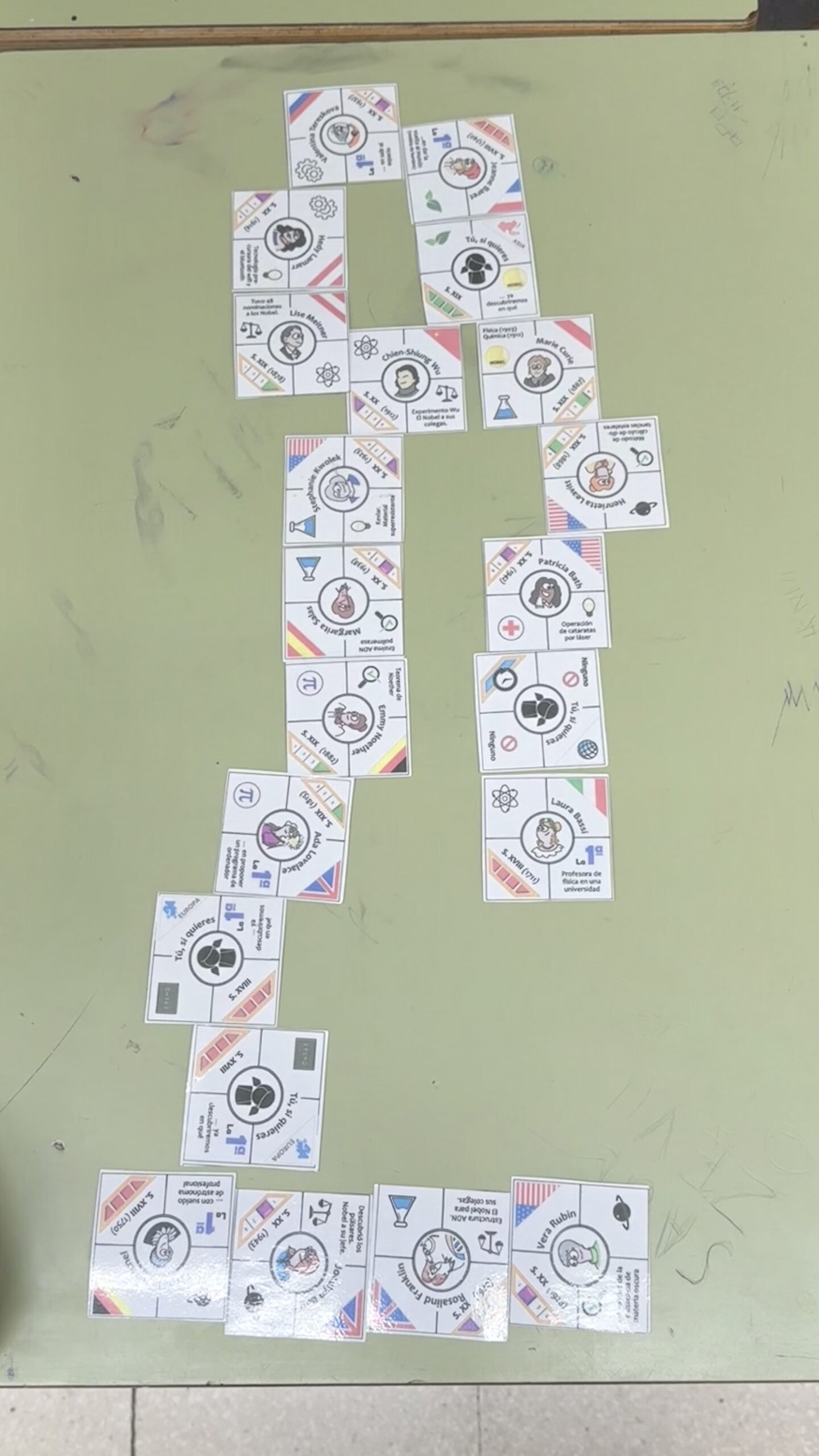 Cada carta presenta una científica i es divideix la informació en 5 parts: El retrat i el nom de la dona al centre, el país de naixement, algun detall sobre la seva vida, el segle en què va néixer i la branca de la ciència en què va desenvolupar el seu treball.