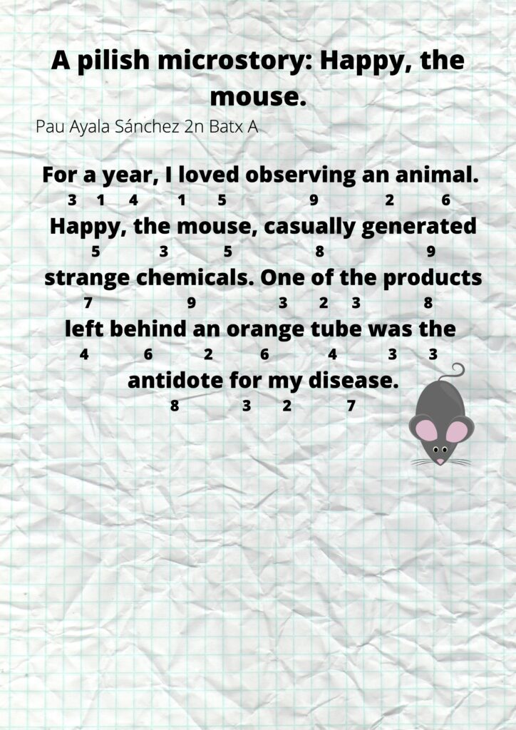 I els alumnes de 2n de batxillerat han tingut un plus de dificultat, ja que han hagut d’escriure les seves microhistòries seguint el patró del número pi! És a dir, la primera paraula havia de tenir 3 lletres, la segona 1, la tercera 4… No us perdeu l’exposició que farem de totes les històries pels passadissos del centre!