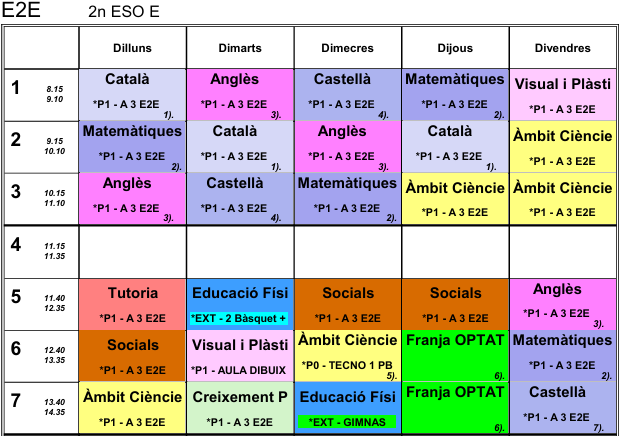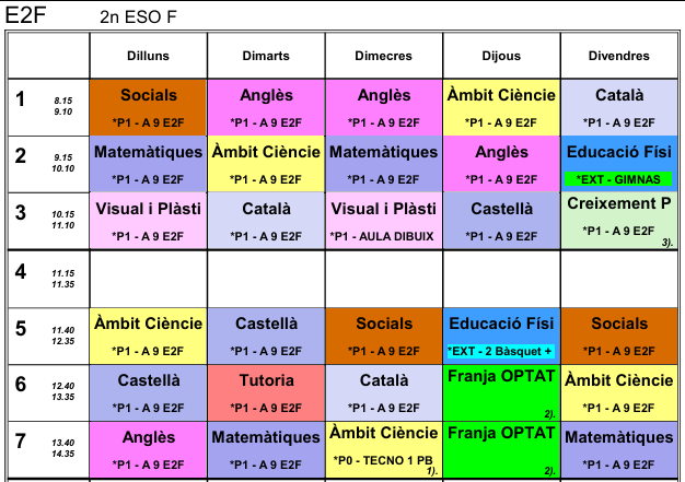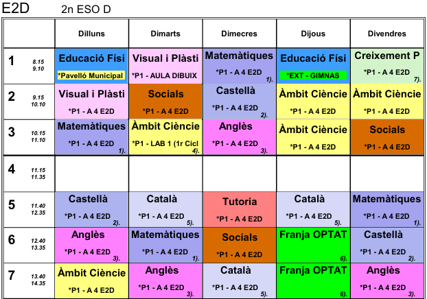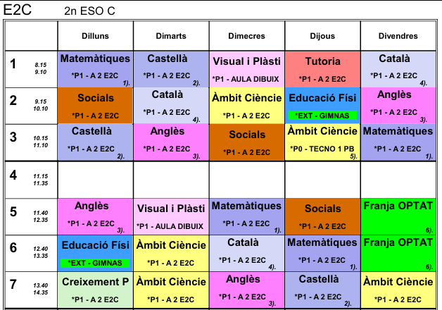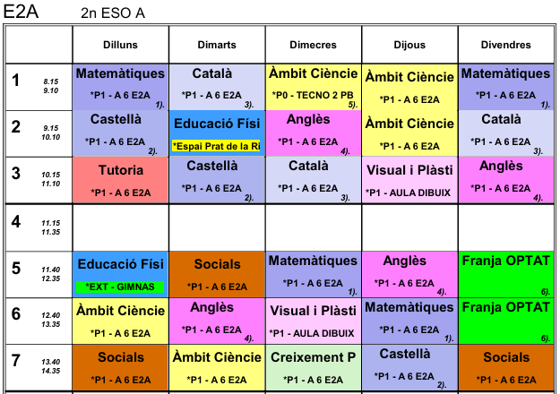 Les matèries que marca el currículum de 2n d’ESO i la seva càrrega horària setmanal són: