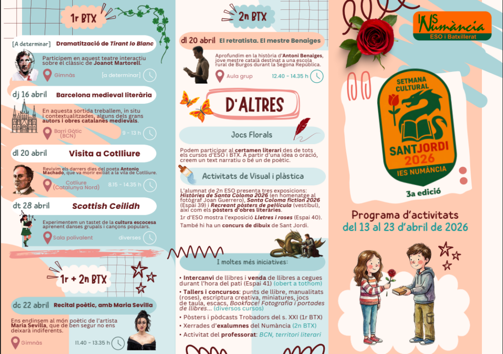 Amb motiu de la diada de Sant Jordi, el nostre institut celebra una nova edició de la Setmana Cultural, que enguany s’estén al llarg de dues setmanes plenes d’activitats. Aquest ampli programa converteix el centre en un espai viu on la cultura es manifesta en totes les seves formes.