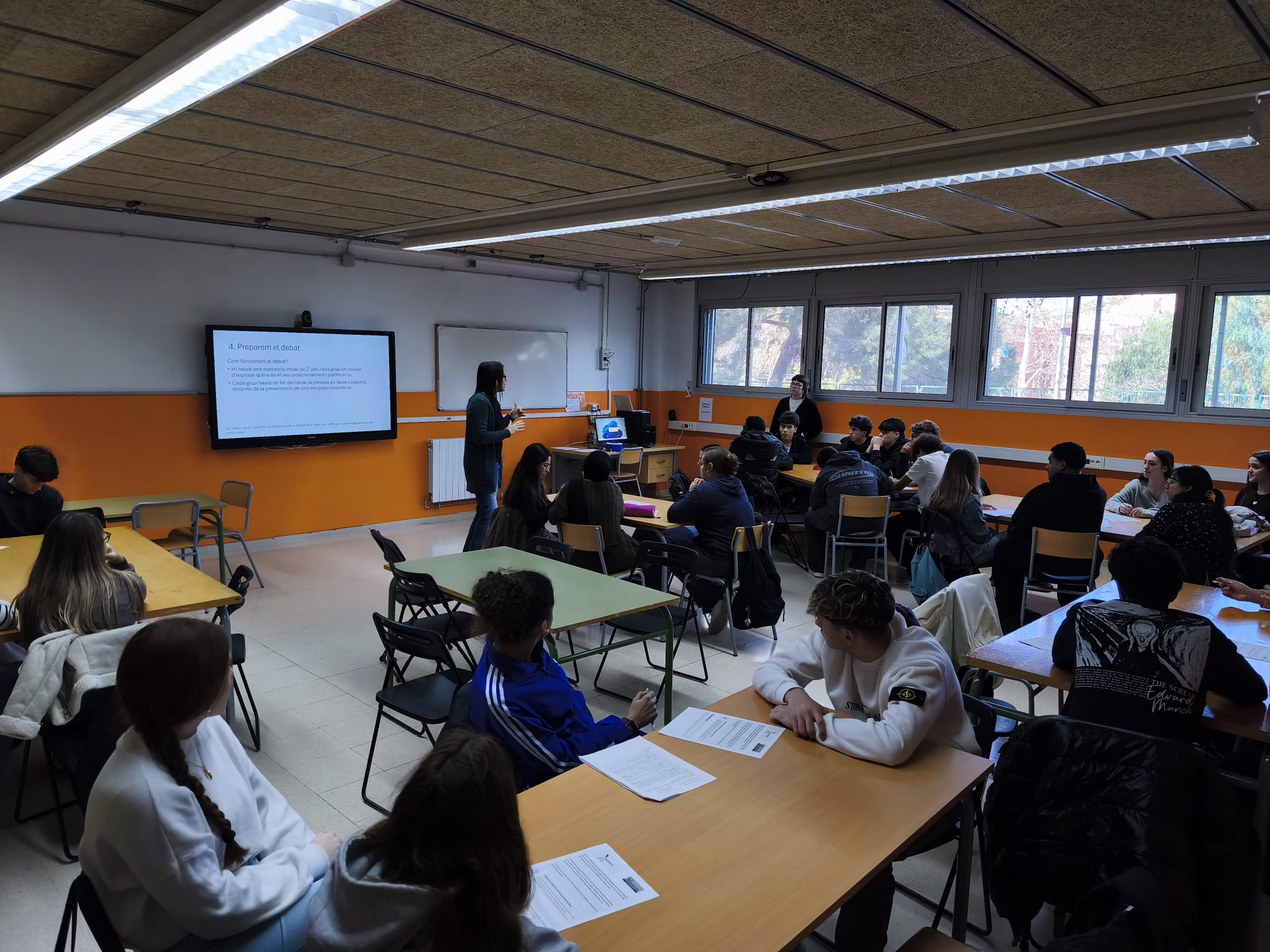La segona sessió del taller hem prestat atenció al guió que farem servir el dia del debat. Durant aquest temps, els diferents grups ens hem preparat les presentacions, els arguments i contraarguments que farem servir amb l’ajuda de tota la informació recol·lectada durant aquests mesos de treball. En últim lloc, hem rebut diferents consells sobre com hem de parlar davant d’una multitud en aquest tipus d’ambient.