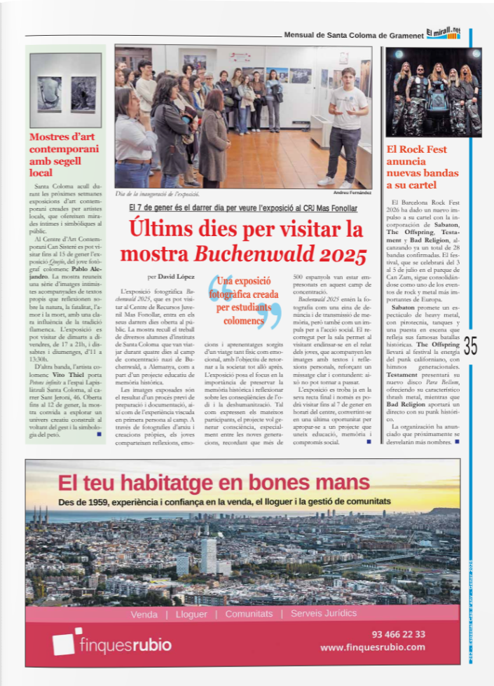 Els alumnes Jon Romero, Laura López, Ona Garcia i Abel Gracia de 2n de Batxillerat han participat en l’exposició fotogràfica Joves contra l’oblit. Buchenwald 2025, un projecte educatiu i de memòria històrica que recull l’experiència d’un viatge pedagògic al camp de concentració nazi de Buchenwald (Alemanya).