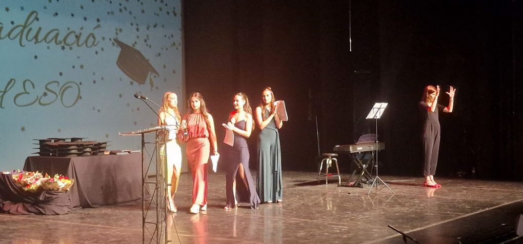 L’acte va comptar amb els discursos de la directora del centre, Marta Gómez, els tutors i tutores, i representants de l’alumnat, que van compartir records, agraïments i reflexions sobre una etapa que arriba al seu final. També vam gaudir d’actuacions musicals que van posar el toc artístic i emotiu a la vetllada, fent-la encara més especial i memorable. I no ens podem oblidar de les 4 presentadores que van portar l’acte amb molta professionalitat i del vídeo superoriginal de fotos i signatures.