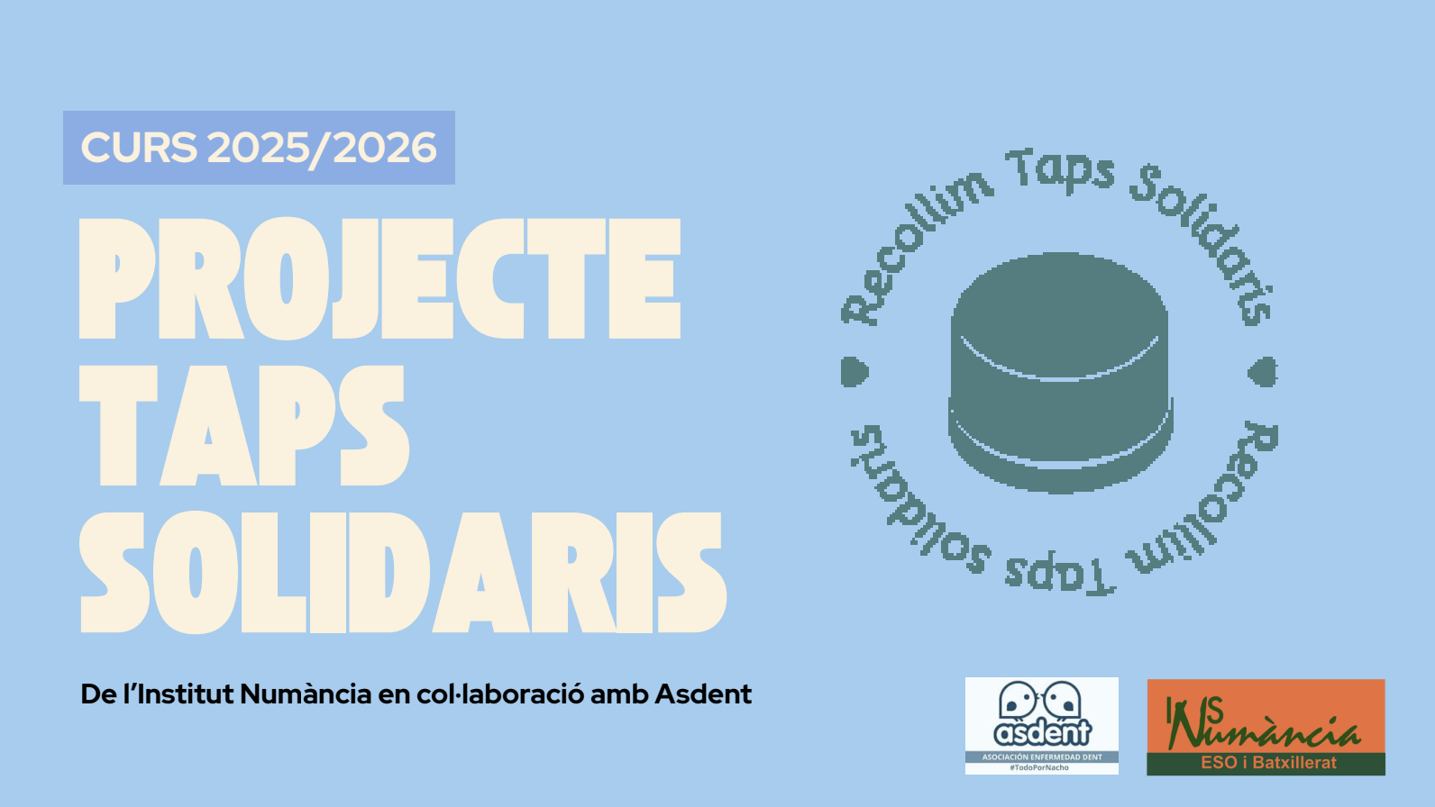 L’alumnat de 2n d’ESO C ha impulsat una campanya de recollida de taps per recaptar fons destinats a la investigació de la malaltia de Dent. Es tracta d’una iniciativa molt especial, dedicada al Nacho, alumne del centre, que enguany finalitza la seva etapa a l’institut.