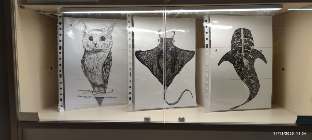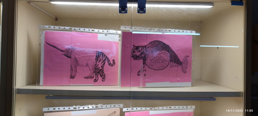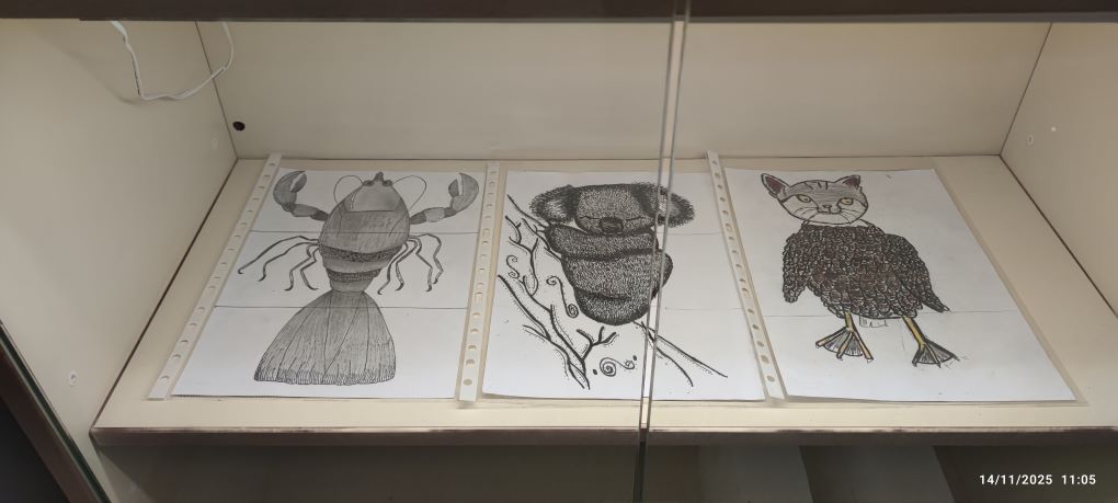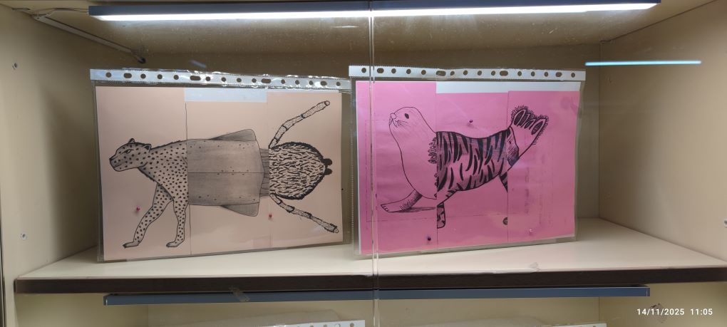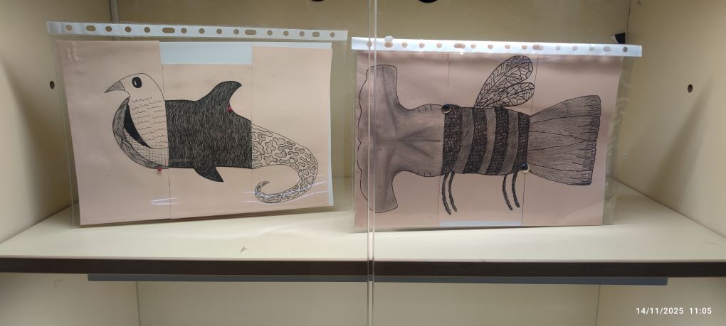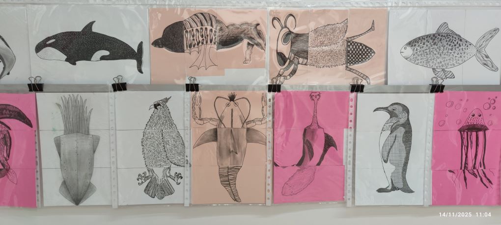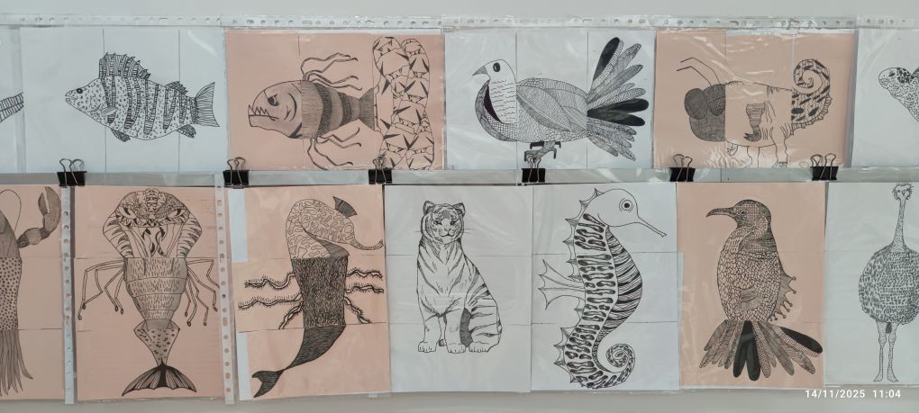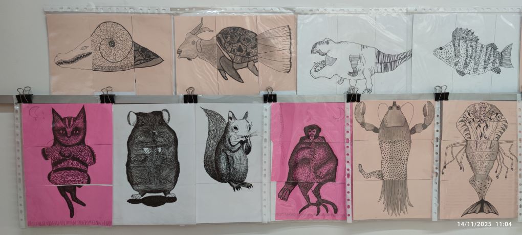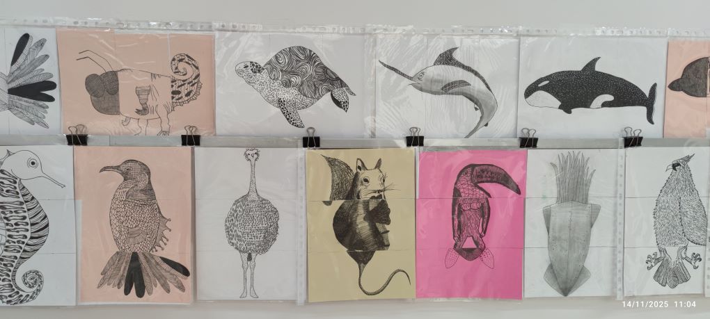Els estudiants han partit del dibuix d’observació del món animal i han treballat les textures gràfiques, estudiant com representar pells, plomes i altres superfícies que defineixen la varietat d’espècies. A partir dels seus dibuixos, l’alumnat ha utilitzat la tècnica del cadàver exquisit per crear animals fantàstics: éssers híbrids sorgits de la combinació aleatòria de parts de diferents dibuixos.