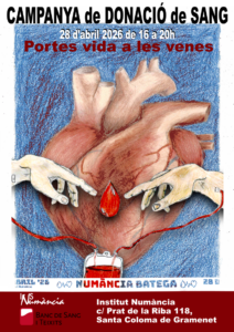 El pròxim dimarts 28 d’abril de 2026, l’institut es mobilitza de nou per una causa solidària amb la celebració de la 3a edició de la Diada de la Sang al Numància. L’esdeveniment tindrà lloc de 16.00 a 20.00 hores i està obert a tota la ciutadania que vulgui contribuir a salvar vides amb un gest senzill però imprescindible: donar sang.