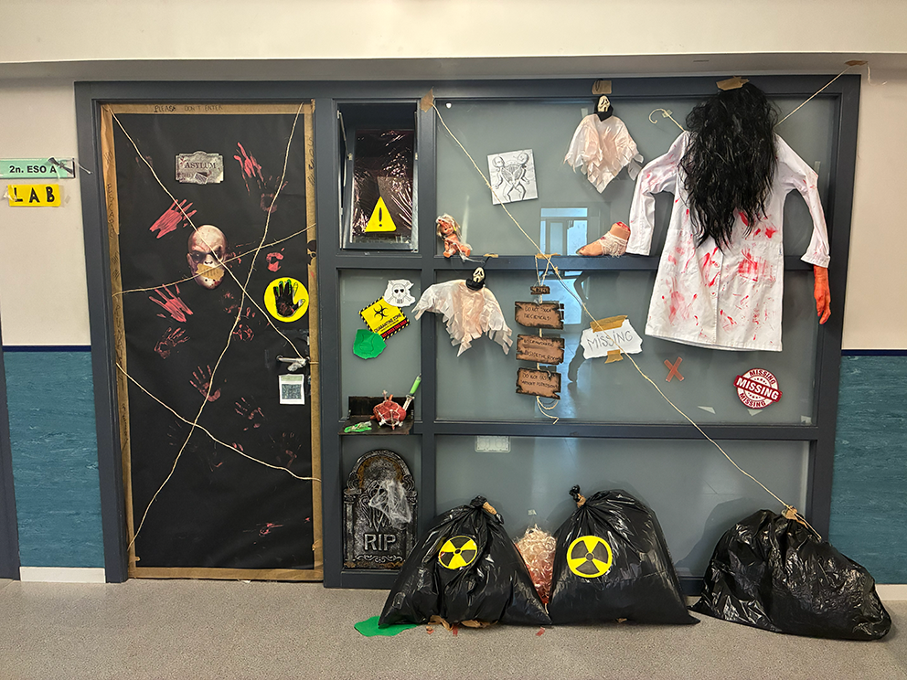 The students of 2nd B of Batxillerat at Font del Ferro High School have created a fantastic Halloween door. This year, it is not a typical scary door with ghosts and witches. It is a crime scene!