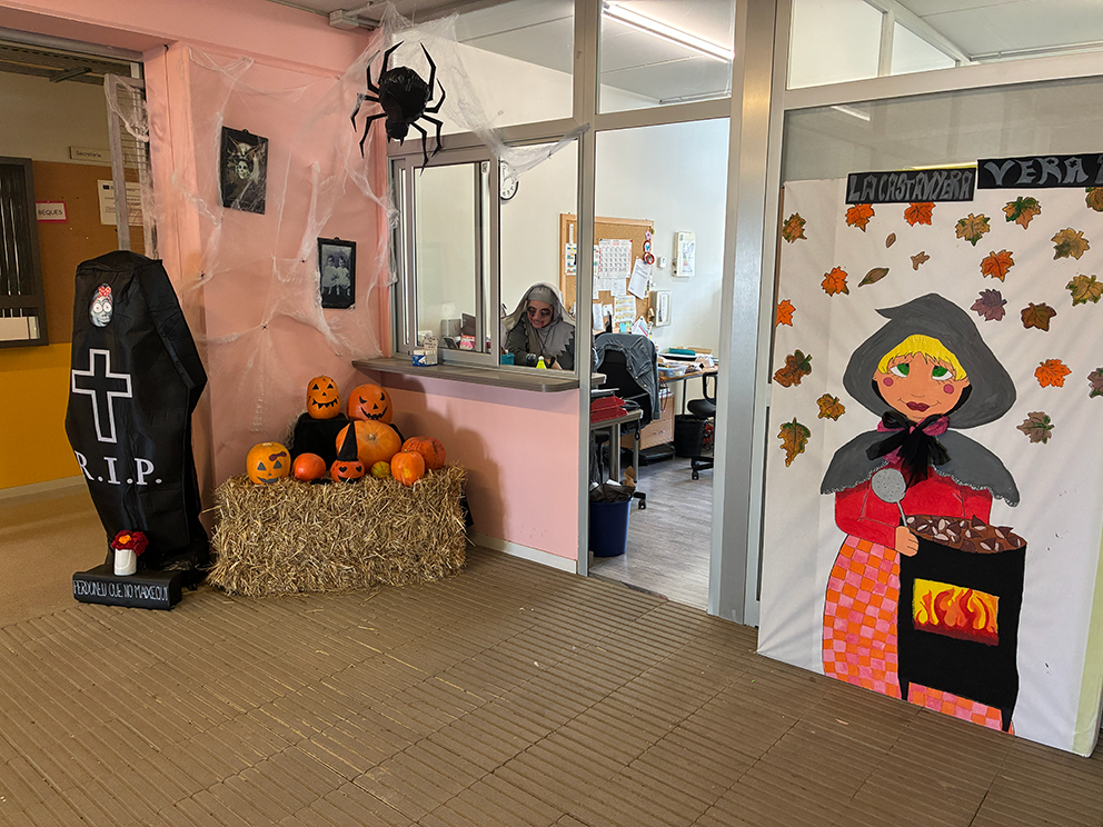 There are pictures of different students, the delegate, Sofia Gómez, the sub-delegate Aleix Segura and other classmates like Biel Nadoll who helped a lot. They all have their ages in the paper, too.The 2nd of Batxillerat class has done an amazing job. They used their creativity to make a door that is not only perfect for Halloween but also a fun game for the whole school.