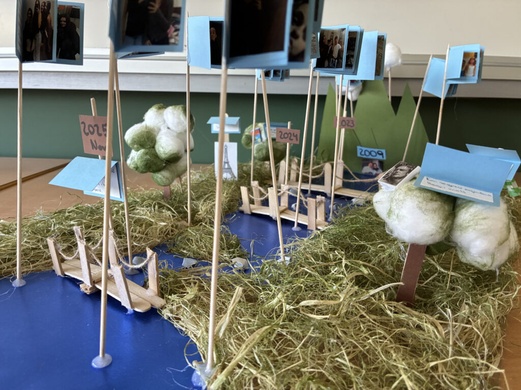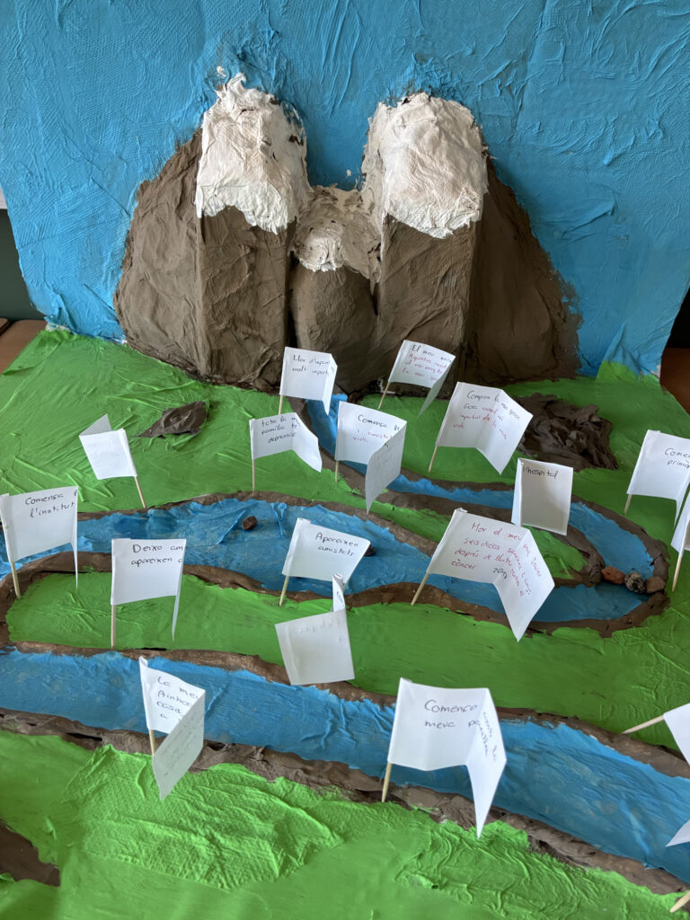 Per plasmar aquest aprenentatge, hem utilitzat la metàfora del “riu de la vida”. I és que com fa l’aigua, la nostra existència flueix, creix, rep la influència d’afluents externs i, sovint, ha de sortejar obstacles orogràfics que ens obliguen a canviar de rumb. Aquest exercici ha permès a l’alumnat visualitzar el seu recorregut vital des de la infantesa fins a l’actualitat.