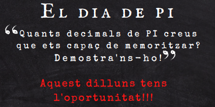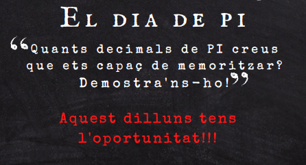 1. El concurs consisteix a memoritzar el nombre més gran de decimals del número PI possibles. 2. El concurs tindrà lloc el dia 14 de març al vestíbul de l’Institut Pau Claris 3. Poden participar en el concurs els alumnes d’ESO i batxillerat. 4. La participació serà individual o en grup, si té una coreografia. 5. Els participants poden recitar els decimals tal qual, o bé, poden fer servir una base musical, un rap, etc. També, si volen, poden preparar una senzilla coreografia. 6. S’admetran fins a 3 errades. Després d’una errada es podrà seguir enumerant decimals. 7. Guanyarà el concurs el participant que enumeri més decimals del nombre PI. 8. Es lliurarà un premi al 1r, 2n i 3r dels alumnes que hagin memoritzat més decimals. Es farà entrega dels premis el dia de sant Jordi.