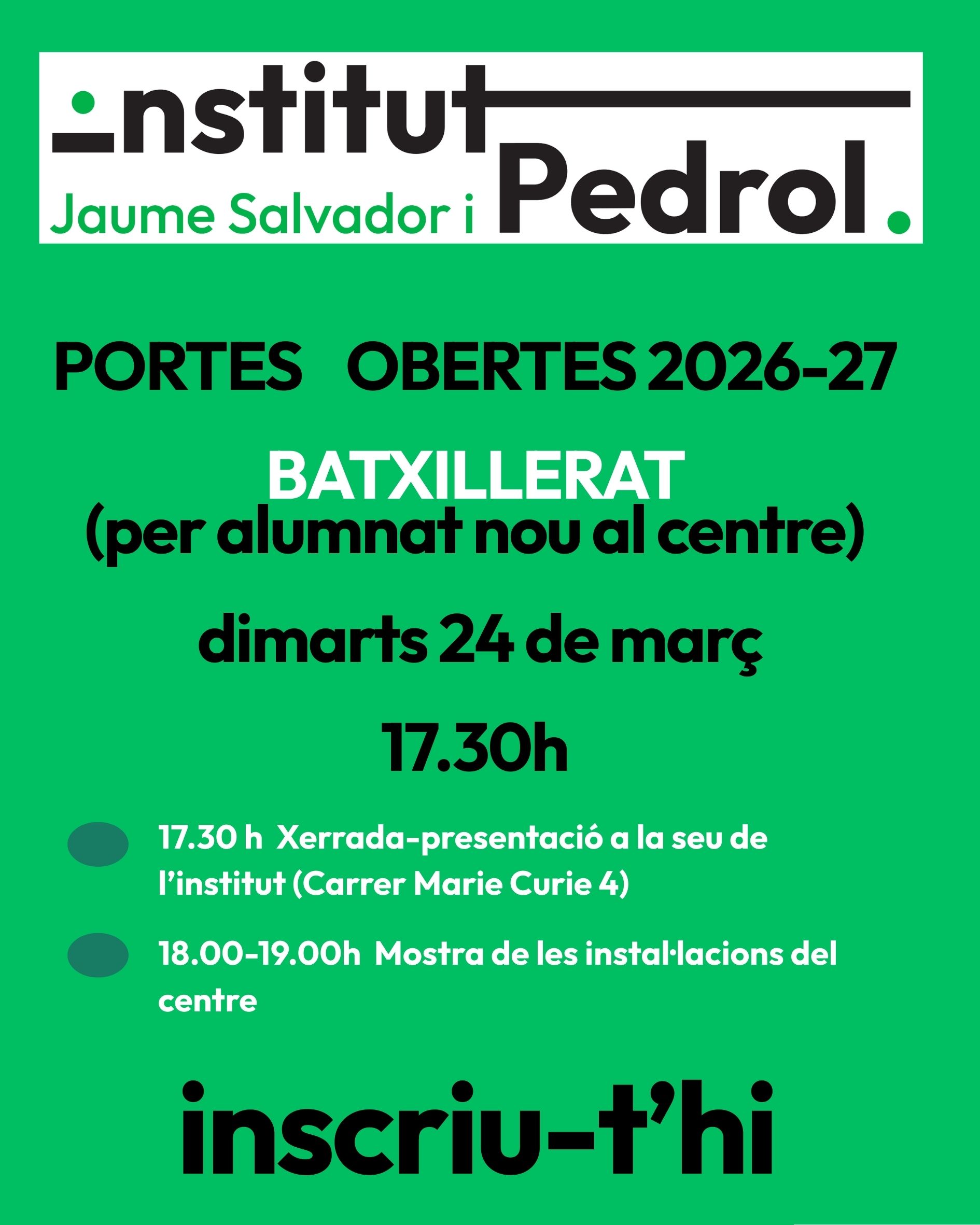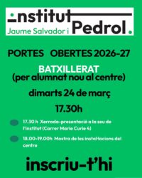 Dimarts 24 de febrer vàrem gaudir de la jornada de portes obertes a institut públic Jaume Salvador i Pedrol Compartim amb vosaltres un petit recull del que conforma la nostra essència, la nostra filosofia, per tal que ens pugueu conèixer una mica més.🙂🎷🪕💻📽️📚🔎📝📊📐🔬🏀🎾 Esperem que ca nostra sigui ca vostra.