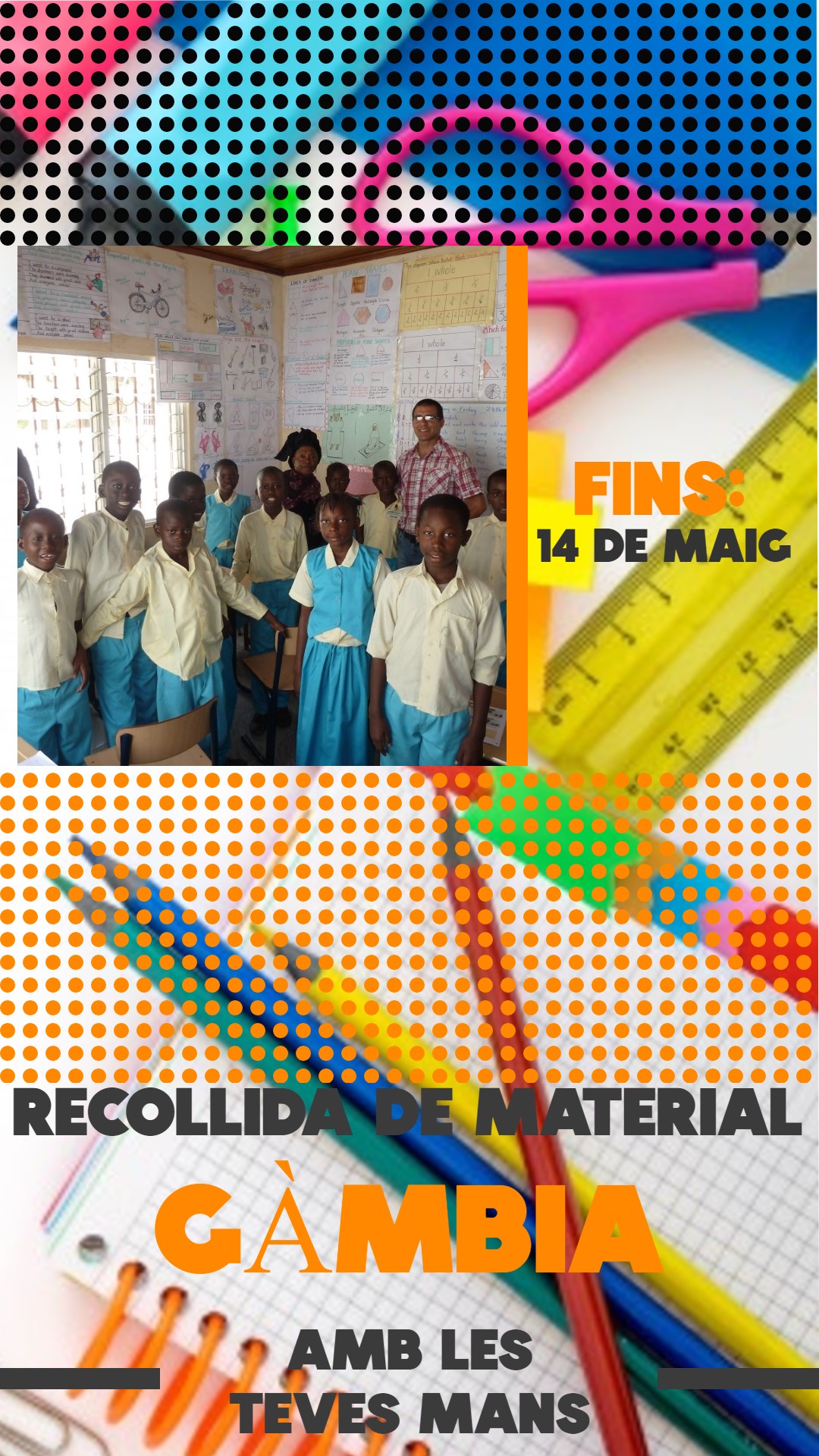 Dins el Servei comunitari, l’alumnat de 3r d’ESO està col·laborant amb una campanya de recollida de material escolar per una escola Gàmbia organitzada per l’ONG “Amb les teves mans”. Si voleu participar, podeu portar a l’institut aquell material que teniu a casa i no feu servir: llapis, colors, plastidecors, retoladors, llibretes, gomes, maquinetes, etc. La campanya estarà oberta fins el dia 14 de maig. Gràcies per la vostra ajuda!