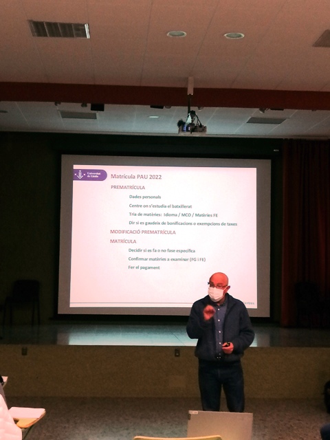 Avui, el coordinador de les PAU de la UdL ens ha visitat per a fer una xerrada als alumnes de 2n de btx. Ha explicat com és el procediment de prematrícula i matrícula de les PAU i com és el d’accés i admissió a la universitat. L’alumnat ha pogut demanar tots els dubtes que tenia abans de tancar el període de prematrícula de les PAU, que us recordem que finalitza el dimecres 23 de febrer.