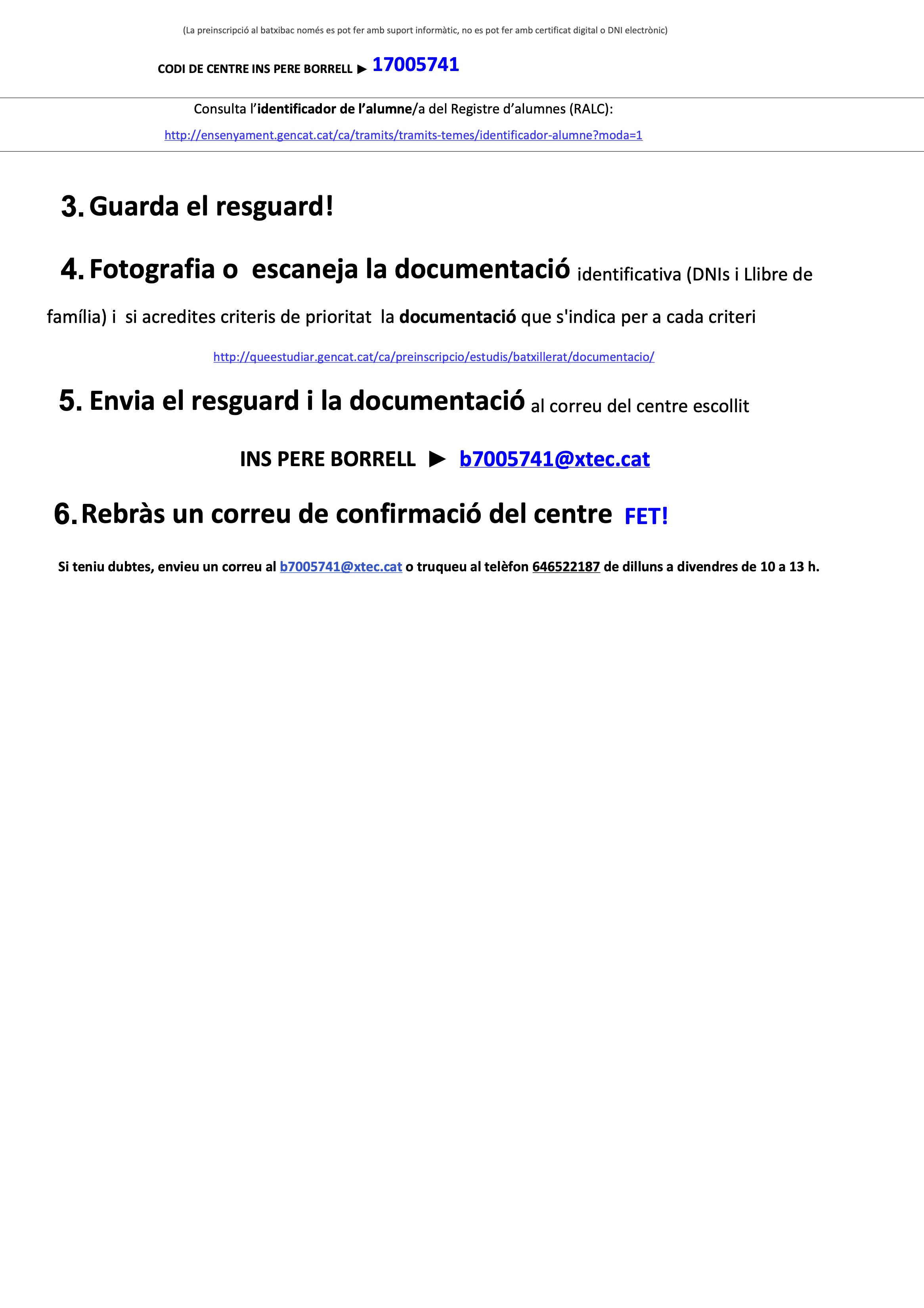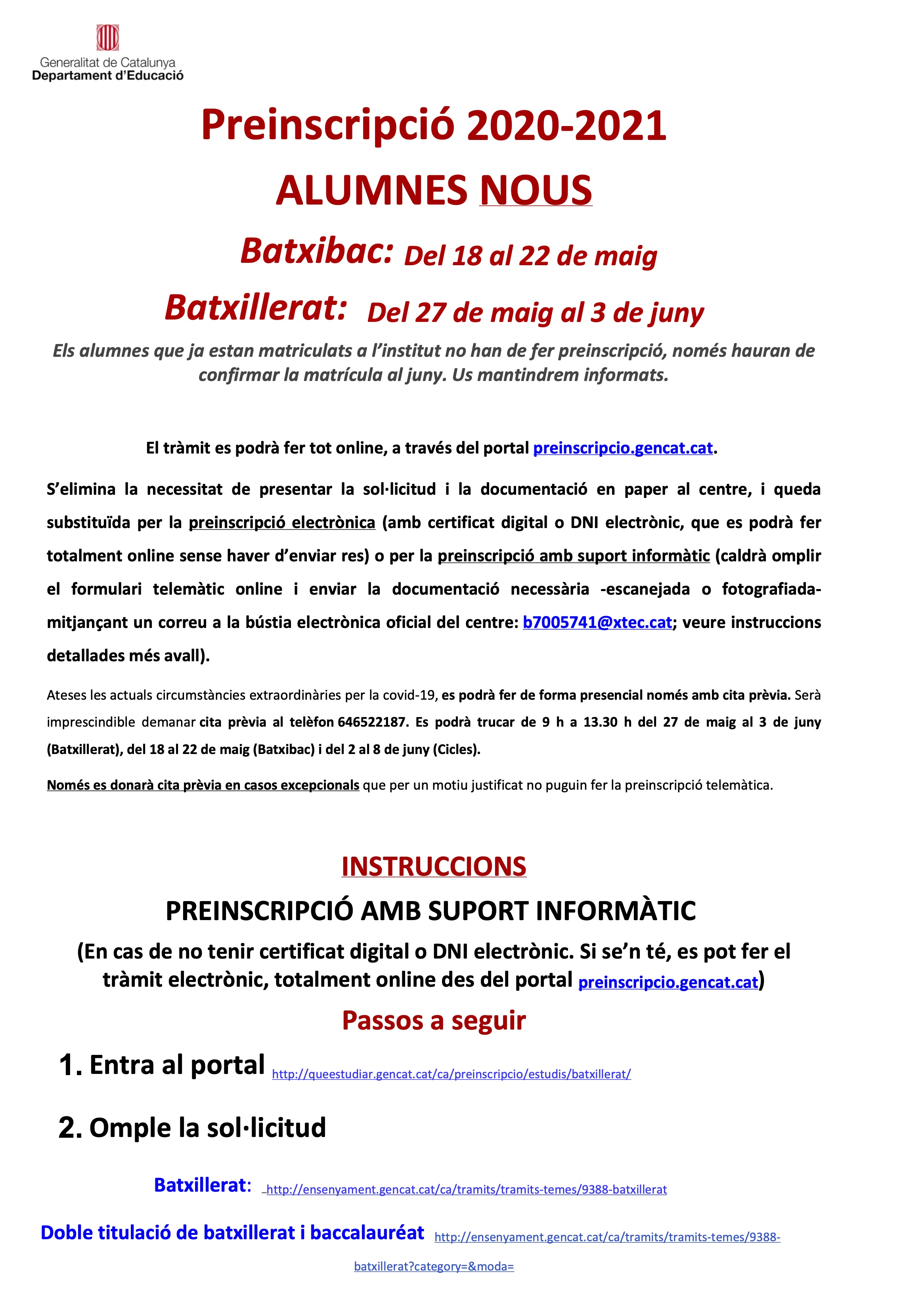 • Preinscripció batxillerat 2020-2021