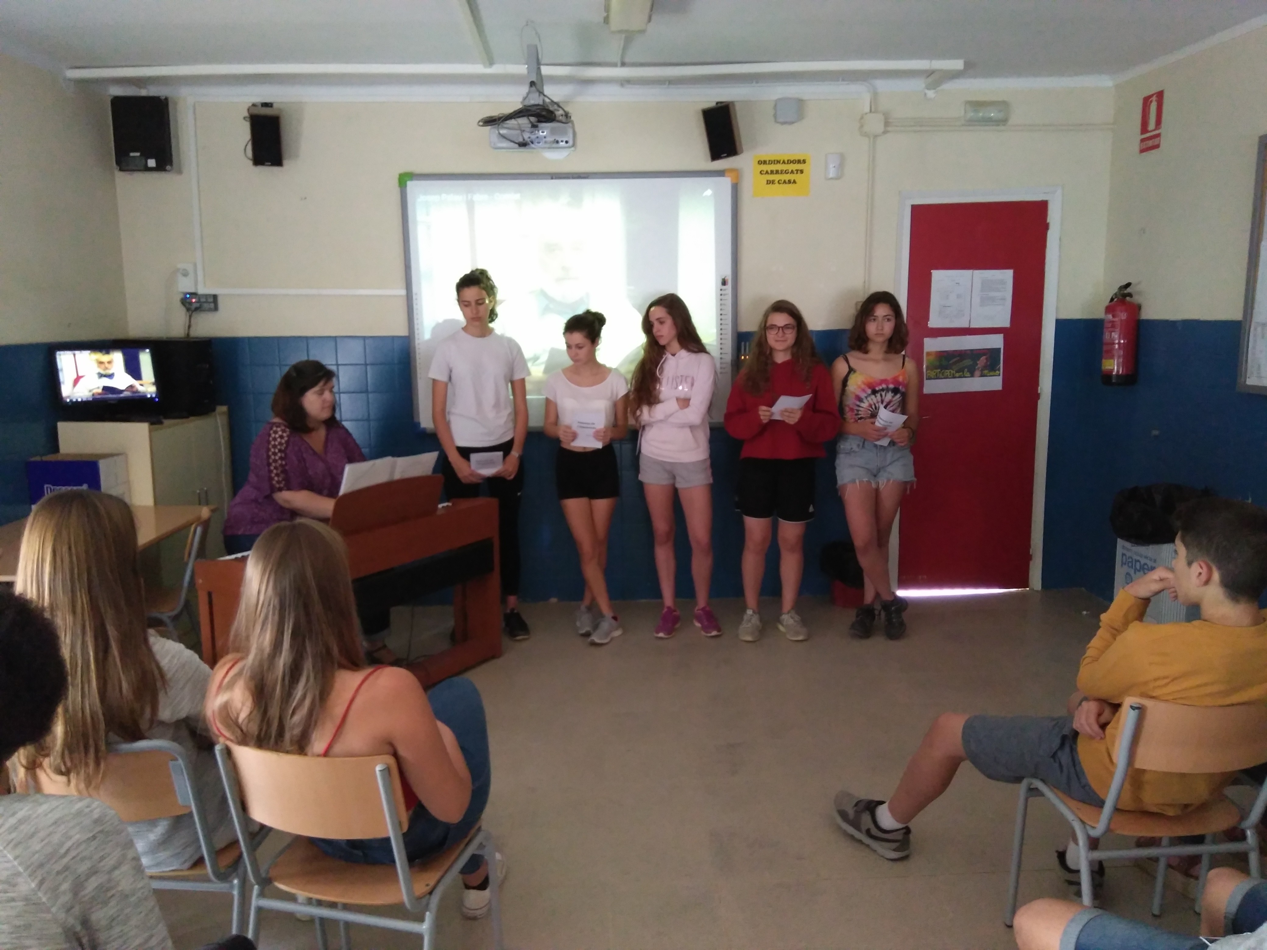 Aquest dilluns, dia 5 de juny, vam rebre la visita d’un grup d’alumnes i professors de l’INS Font del Ferro de Palafolls. La Norah, la Marta, la Sara, la Carolina i l’Alba, cinc alumnes de 1r de batxillerat, acompanyades al piano per la professora Susanna Castaño, i dirigides per Josep Hernàndez, van oferir als nostres alumnes de 4t d’ESO un recital de poemes de Josep Palau i Fabre. El recital constava d’una selecció de textos del llibre Poemes de l’alquimista i va acabar amb la projecció d’un breu vídeo històric en què el mateix Palau i Fabre recitava el seu poema “Comiat”. Amb aquest acte ens hem sumat a la celebració del centenari del naixement del poeta.
