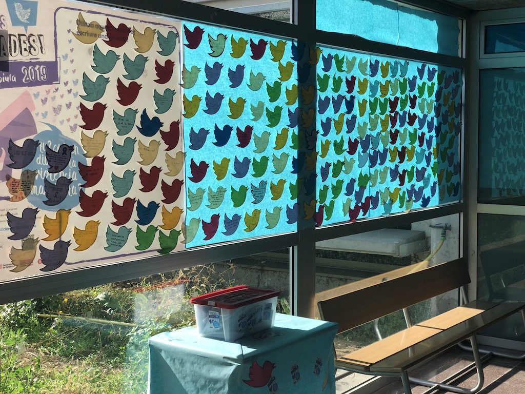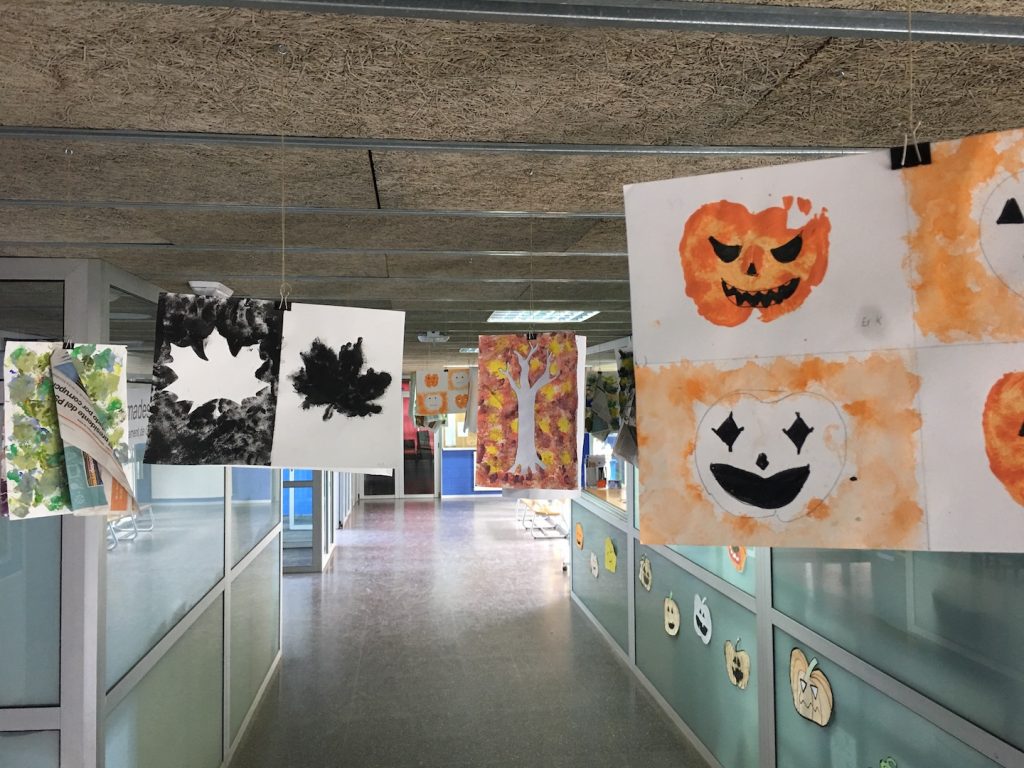 La setmana passada, amb motiu de la castanyada, els alumnes de 1r d’ESO van col·laborar per decorar l’entrada de l’institut. Els treballs estan fets mitjançant la tècnica de l’estampació i Cada classe va treballar un motiu diferent.