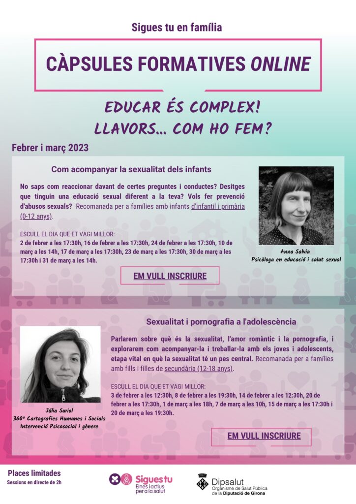 Inscripció AQUÍ Des del programa Sigues tu en família ofereixen unes sessions de formació que pensem que són molt interessants. Al llarg del mes de febrer i març ofereixen la formació online de dues hores per a famílies Sexualitat i pornografia a l’adolescència. Parlaran sobre què és la sexualitat, l’amor romàntic i la pornografia, i s’explorarà com acompanyar-la