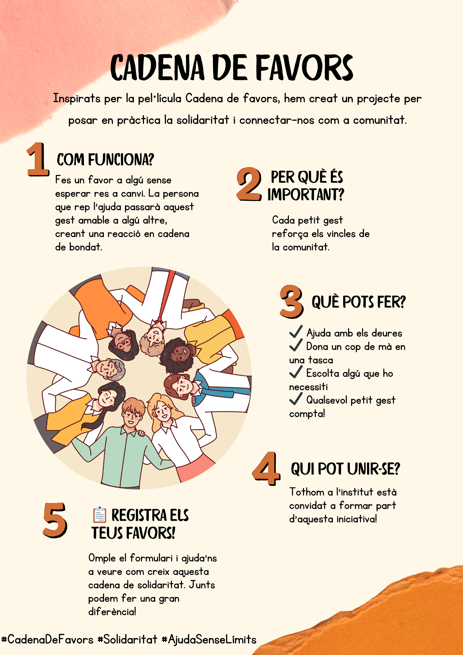 És molt senzill. Si vols participar, només has de fer un favor a algú. Pot ser qualsevol cosa: des d’ajudar amb els deures, oferir una mà en una tasca, compartir qualsevol cosa que tinguis, o simplement escoltar algú que ho necessiti. Quan facis el teu favor, la persona que el rep pot continuar la cadena ajudant a un altre. D’aquesta manera, la nostra cadena no pararia mai de créixer.