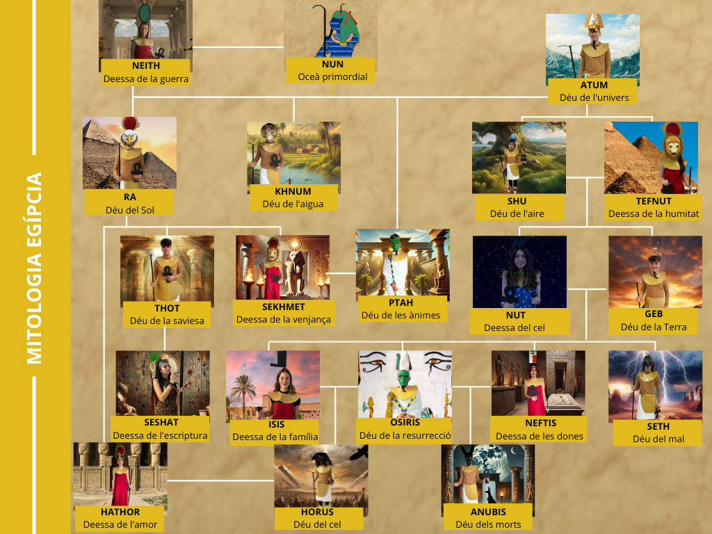 Concretament en aquest primer trimestre ens hem convertit en Déus egipcis. Cada alumne ha escollit un déu/deessa per investigar-lo, conèixer-lo a fons i explicar-lo a la resta dels seus companys. Per això, hem utilitzat com a suport un Museu virtual on es representen tots els alumnes caracteritzats com les divinitats i els Memes que han confeccionat reflectint trets característics del seu déu/deessa.