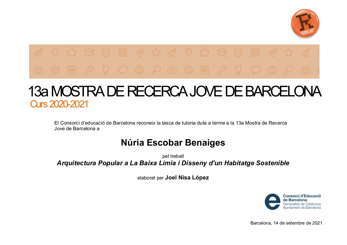 Núria Escobar Benaiges, professora d’Educació Visual i Plàstica i de Dibuix tècnic del nostre centre, ha rebut un reconeixement a la seva tasca com a tutora del treball de recerca “Arquitectura Popular a La Baixa Limia i Disseny d’un Habitatge Sostenible”, presentat per l’alumne Joel Nisa López durant el curs 2020-2021.