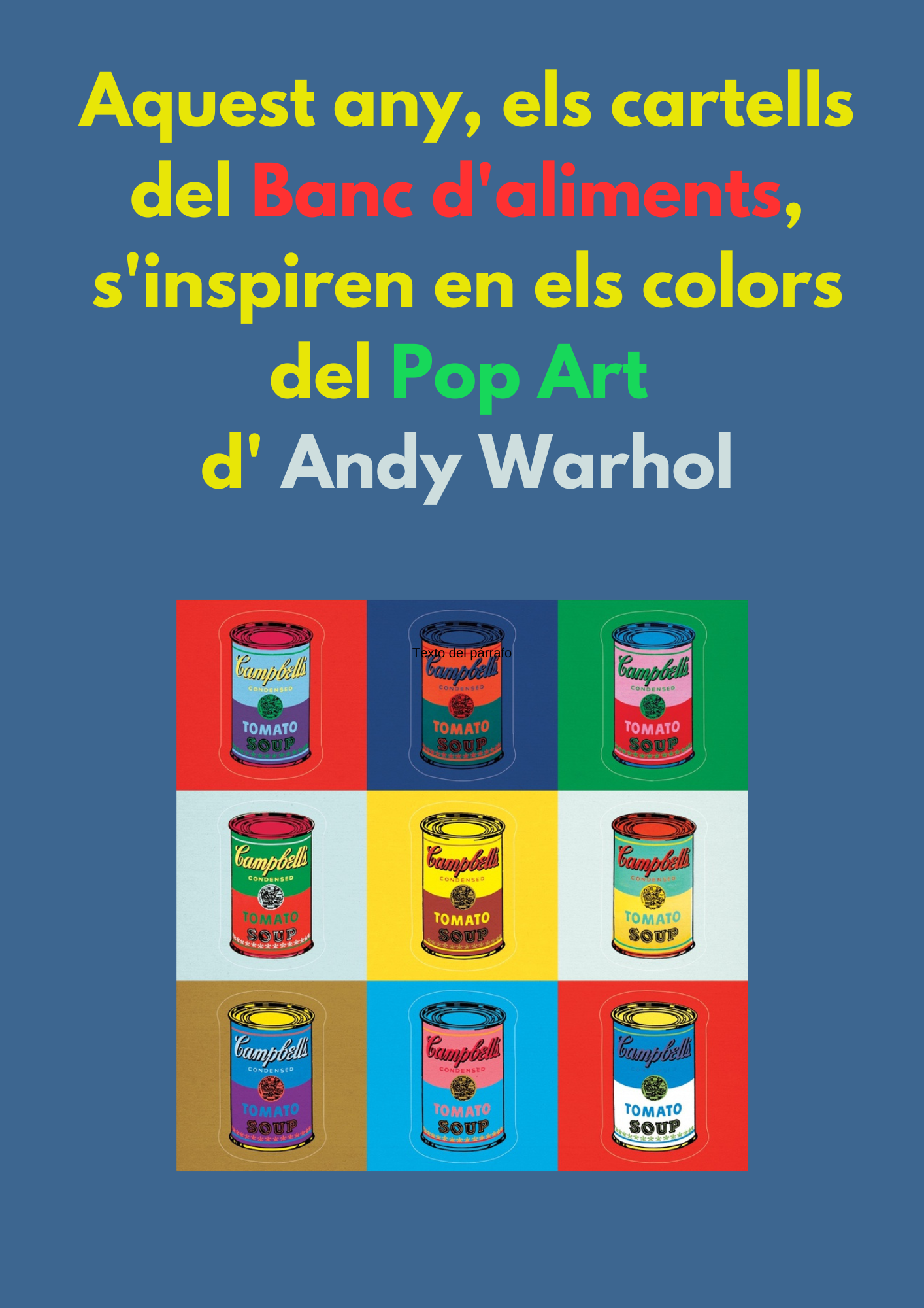 Amb la seva proposta, ens acostem als colors del Pop Art de l’artista d’Andy Warhol. Partint d’un únic disseny, hem creat 9 propostes de colors diferents, utilitzant els mateixos tons que l’artista va fer servir en la seva famosa obra “Campbell Soup”.