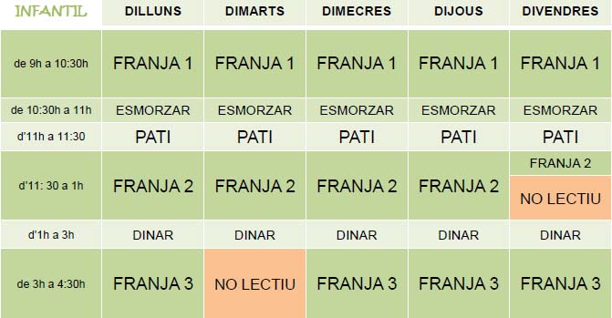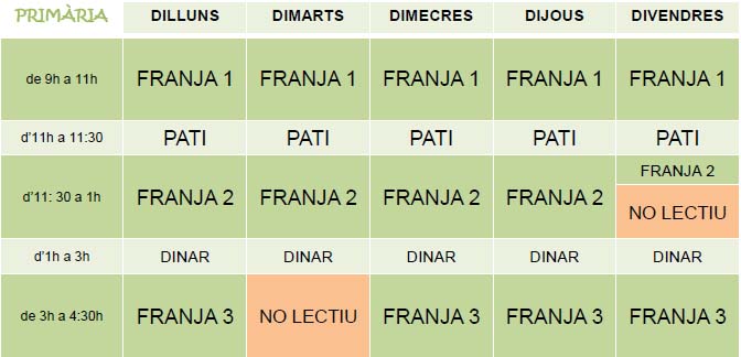 L’alumnat d’infantil i primària entrarà a les 9h al centre i els dilluns, dimarts, dimecres i dijous sortirà a les 13h per dinar. L’horari de tarda serà de 15h a 16:30h, excepte els dimarts a la tarda que no hi haurà classe.