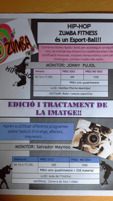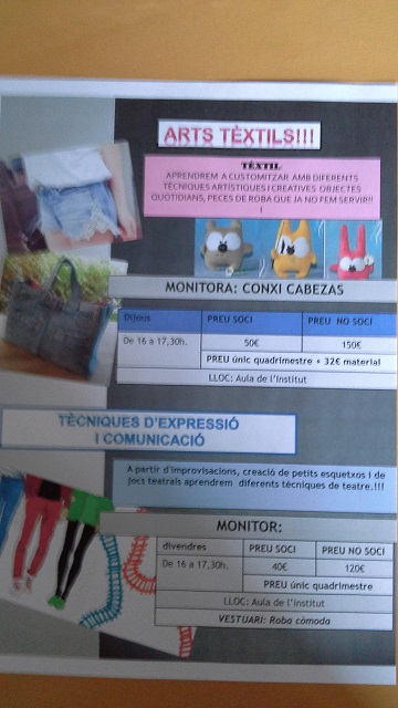 L’AMPA de l’institut ha organitzat per al curs 2016-2017 un munt d’activitats per als alumnes que es duran a terme a les tardes a l’institut. Són pensades per aquells alumnes que tenen ganes de passar-ho bé mentre aprenen, i fer-ho en un context diferent del de les aules.