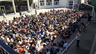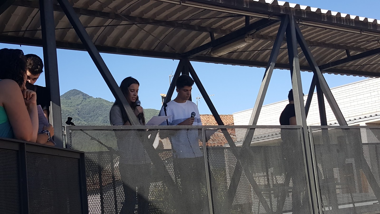 Uns alumnes, en Lluc Prat i la Laura Carreras, han estat els conductors-presentadors de l’acte, i han llegit un poema-cançó en portuguès primer, la Catarina Oliveira, i en català després en Sergi DomÃnguez. La resta d’alumnes han aixecat una banderola, preparada a l’hora de tutoria, on havien escrit una paraula en portuguès i en un moment donat se’ls ha demanat que l’aixequessin enlaire fent-la onejar per fer un mosaic de colors.