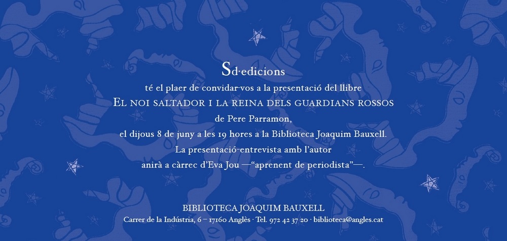 Avui dijous, 8 de juny, a la biblioteca Joaquim Bauxell d’Anglès es farà la presentació del llibre El noi saltador i la reina dels guardians rossos, l’autor del qual és en Pere Parramon, cap d’estudis del nostre institut. Aquesta presentació del seu llibre se suma a les que l’autor ha anat fent des de Sant Jordi. D’altra banda, la presentació del llibre la farà una persona que també ha estat vinculada a l’institut durant tots els seus estudis de secundària, l’Eva Jou, que actualment estudia periodisme a Barcelona, que farà un entrevista a Pere Parramon per a tots els assistents.