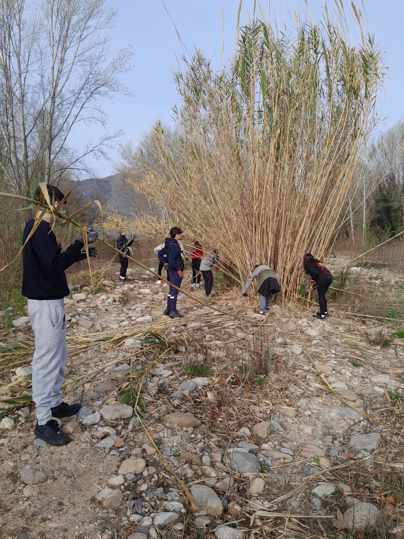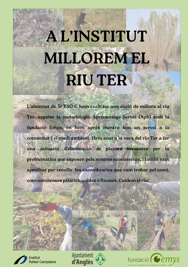 A 3r C hem dut a terme una acció de millora al riu Ter durant 3 sessions, que ha consistit a eliminar totes les plantes invasores que hem pogut (la buddleia, el miraguà, la canya americana i el bambú), ja que generen impactes negatius al bosc de ribera; també vam recollir moltes escombraries que la gent llença irresponsablement al riu. Totes aquestes plantes no són beneficioses pels nostres ecosistemes fluvials pel fet que són espècies exòtiques invasores, i suposen diversos efectes negatius al nostre entorn, com el desplaçament de vegetació autòctona, modificació de cursos fluvials, alteracions en la fauna autòctona, esgotament de les reserves hídriques, entre molts d’altres. Posteriorment, cada grup cooperatiu ha realitzat un pòster (que com podeu veure en l’enllaç més endavant, són bastant diferents, perquè cada grup cooperatiu ens hem especialitzat en l’eliminació d’una espècie invasora en concret, màxim dos) i també una comunicació de la feina feta en diferents formats (cada grup cooperatiu hem treballat en un format diferent) on podreu trobar molts més detalls del nostre projecte: un article detallat a la mostra web (enllaç a l’article), una publicació i un reel a l’instigram de l’institut, un cartell que hem enganxat pel poble (adjuntem una foto), un pòdcast amb la Ràdio Top Anglès (Link Top Anglès, sortim al minut 11), i també hem realitzat un article pel butlletí de l’Ajuntament d’Anglès.