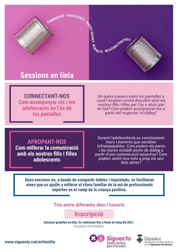 Un altre dels objectius d’aquest programa és facilitar a les famílies espais de reflexió sobre la salut dels seus fills i estratègies per afrontar el procés de desenvolupament dels infants com a persones. Des d’ara fins al mes de maig el programa “Sigues tu” ofereix a les famílies dues formacions en línia on, de la mà de professionals experts, es donaran recursos i eines que serveixin per establir normes i límits, obrir canals de comunicació i, en definitiva, millorar el clima familiar. Les dues càpsules formatives són les següents: