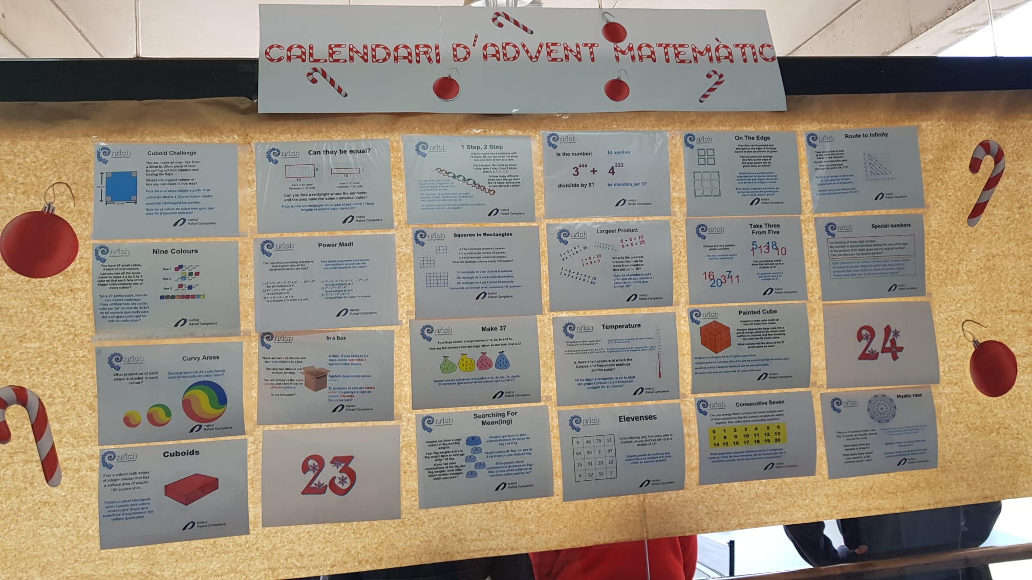 25th December is on the corner, which means that Christmas are here. And it also means that our Advent Calendar comes to an end. We have discovered all the challanges proposed by Mathematics Faculty from Cambridge University within NRich project. We’ve enjoyed all the challenges both in Catalan and English Thanks to the translations from our GEP coordinador, Anna Torrent.
