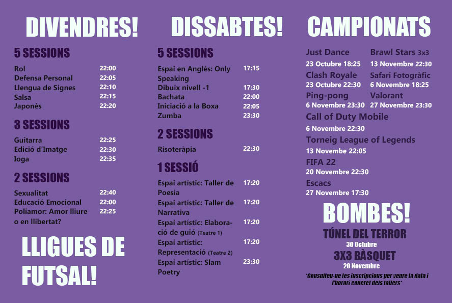 Els dimarts i divendres l’alumnat de 3r d’ESO podrà participar en una lliga de voleyball a la pista número 3 (la petita de baix). Per últim, l’alumnat de 4t d’ESO podrà participar, més endavant, en un torneig de ping pong. Aquesta activitat resta a l’espera que es canviin les taules de ping pong.