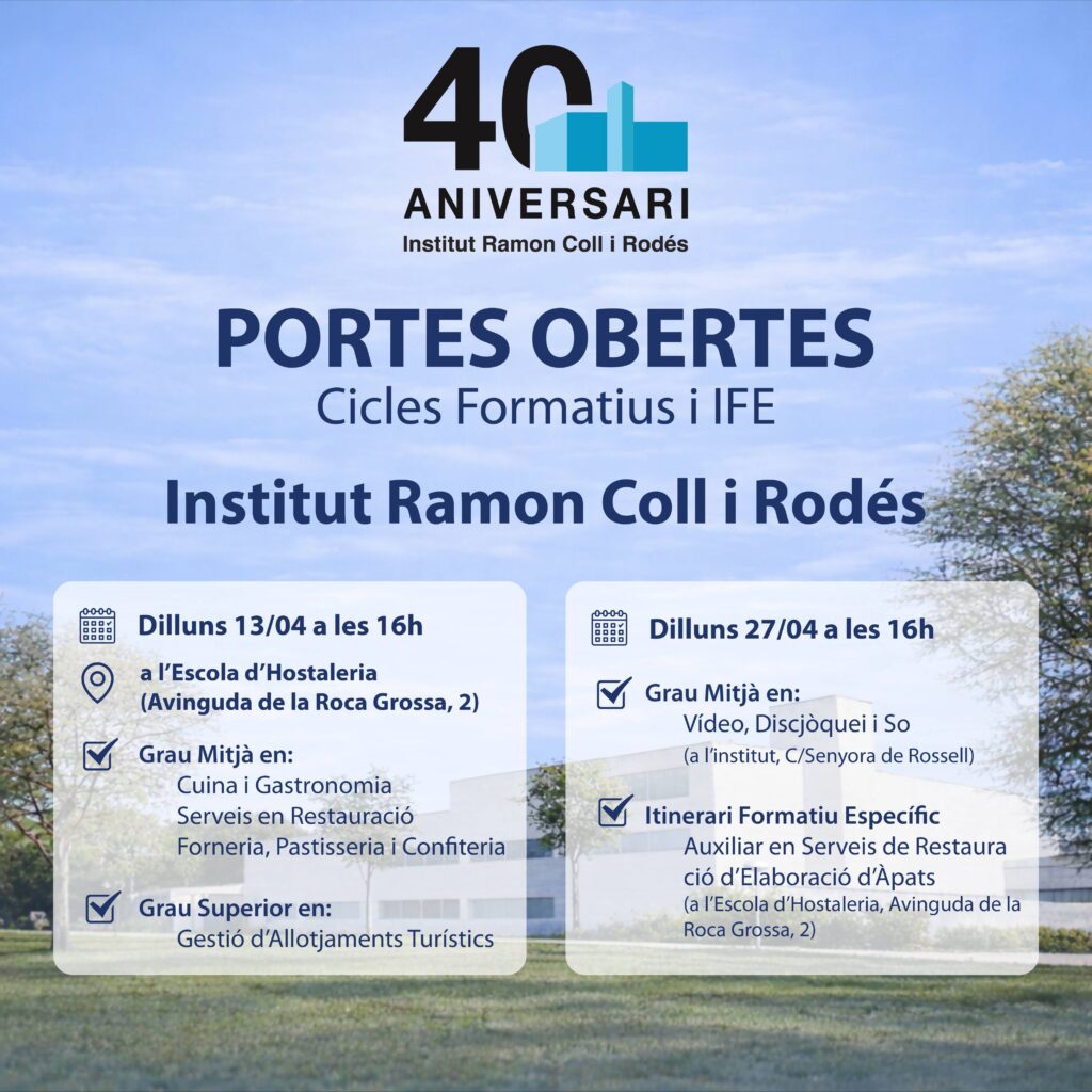 L’Institut Ramon Coll i Rodés celebra el seu 40è aniversari i convida famílies i futurs alumnes a les Portes Obertes de Cicles Formatius i IFE, una oportunitat per conèixer de prop l’oferta educativa, els espais i l’equip docent del centre.
