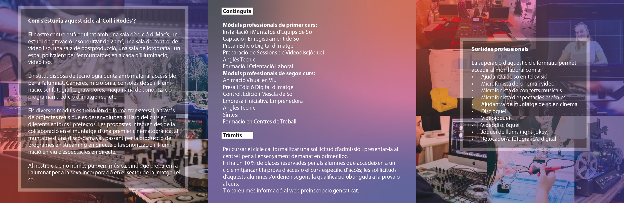El pròxim dimarts dia 19 de març, a partir de les 16h, tindrà lloc la reunió informativa del CFGM de Tècnic/a en Vídeo, Discjòquei i So a la Sala d’Usos Múltiples de l’Institut Ramon Coll i Rodés.