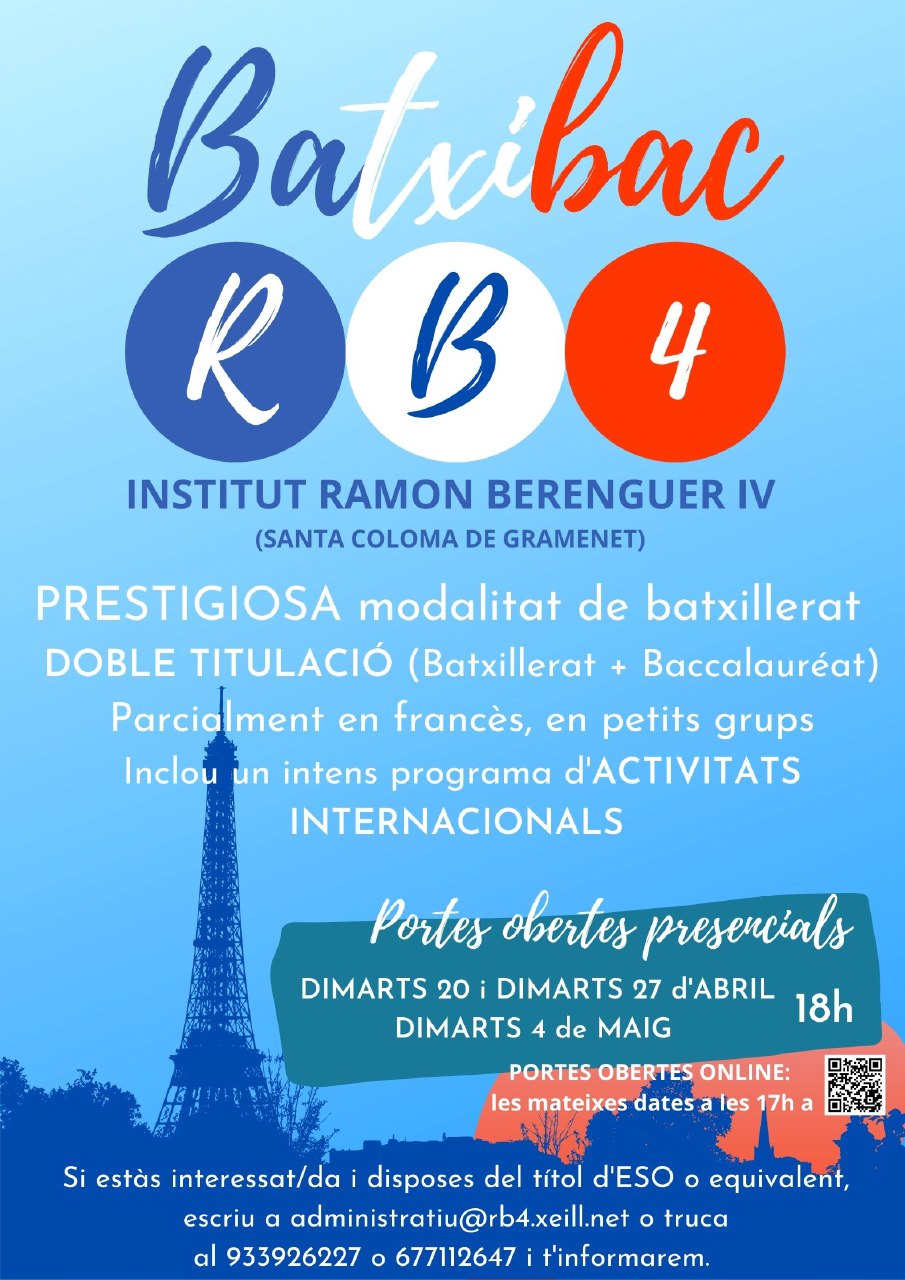 És una proposta molt interessant per aquelles persones que tenen el títol d’ESO i volen fer un batxillerat innovador que inclogui un intens programa d’activitats internacionals! Si ens contactes, t’informarem àmpliament i et recomanem assistir a alguna de les properes sessions de portes obertes presencials o bé en format online.