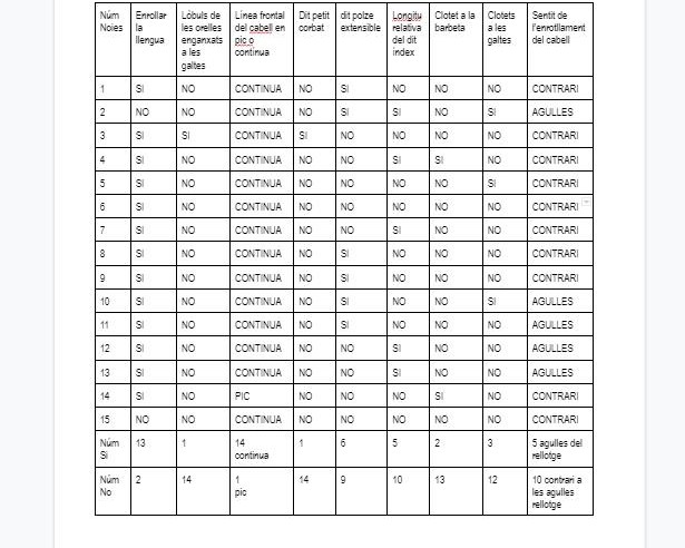 L’alumnat de Biologia de 4t d’ESO ha estudiat la freqüència d’aquests caràcters en els companys de l’institut. L’objectiu és deduir el possible patró d’herència: autosòmic dominant, autosòmic recessiu, lligat al sexe o condicionat pel sexe.