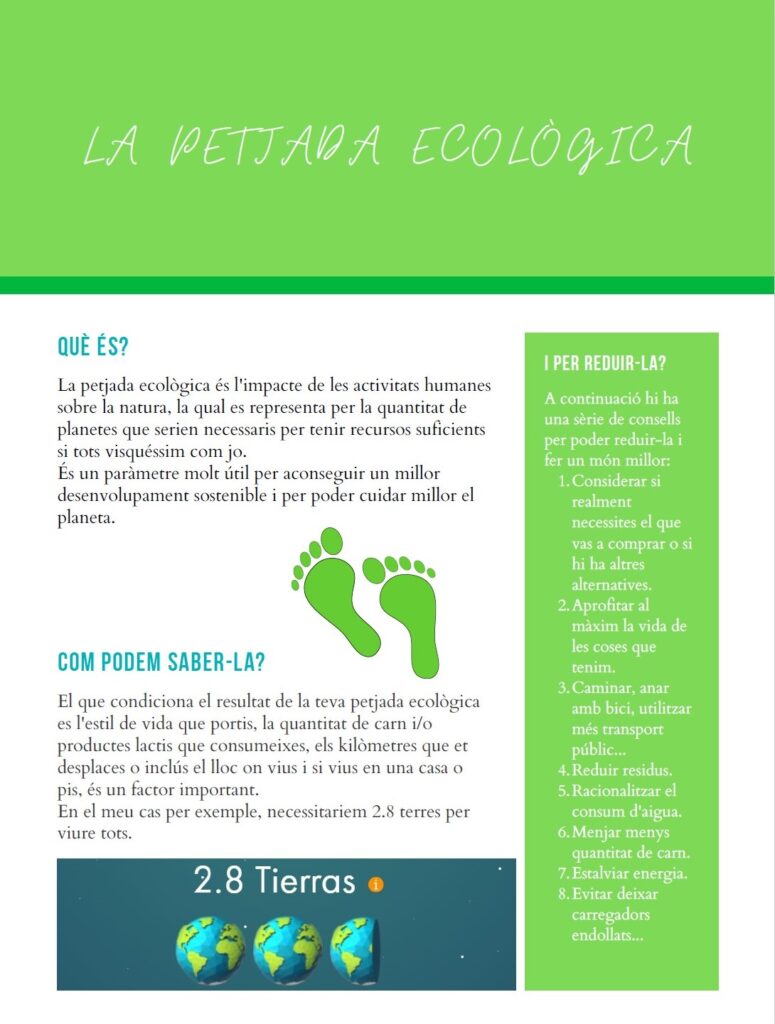 Per determinar a nivell individual quina és la petjada ecològica, l’alumnat ha consultat el web: https://www.footprintcalculator.org/home/en. La superfície de l’habitatge, el consum elèctric, els desplaçaments i el tipus d’alimentació són alguns dels factors més determinants en el càlcul de la nostra empremta ecològica.