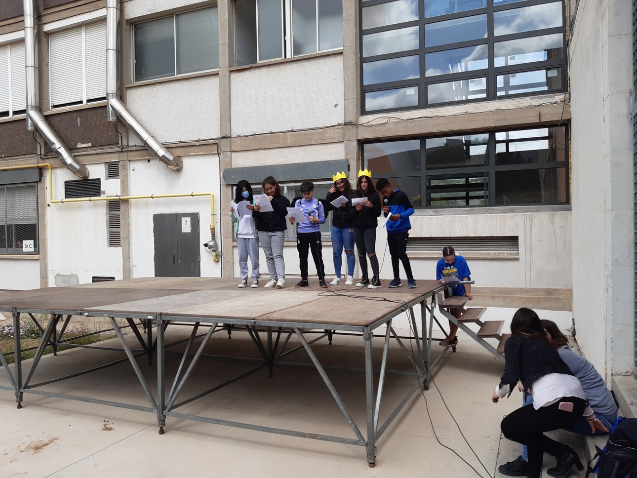 Ha fet un bon dia i hem pogut gaudir de les activitats que s’han preparat al pati: una parada roses i llibres per emportar i un concurs teatral en el qual ha participat tot l’alumnat del centre (primer cicle ha representat la llegenda de sant Jordi i segon cicle i batxillerat han representat un fragment de la coneguda obra d’Àngel Guimerà, Terra baixa). Ho han fet molt i molt bé.