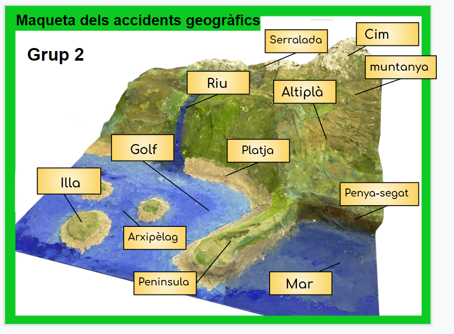 Exemples d’accidents geogràfics que hem introduït a la nostra maqueta són: penya-segats, valls, rius, illes, serralades, muntanyes, delta,… Un cop digitalitzades les diferents maquetes, va començar la tasca de justificació a través d’un presentació Google drive. Cada grup havia de justificar quins accidents havia etiquetat. A més, calia nomenar els accidents que no surten a la maqueta i justificar la seva absència. I, per acabar, cada grup havia d’explicar quin havia estat el procés de creació de la maqueta i dels materials utilitzats.